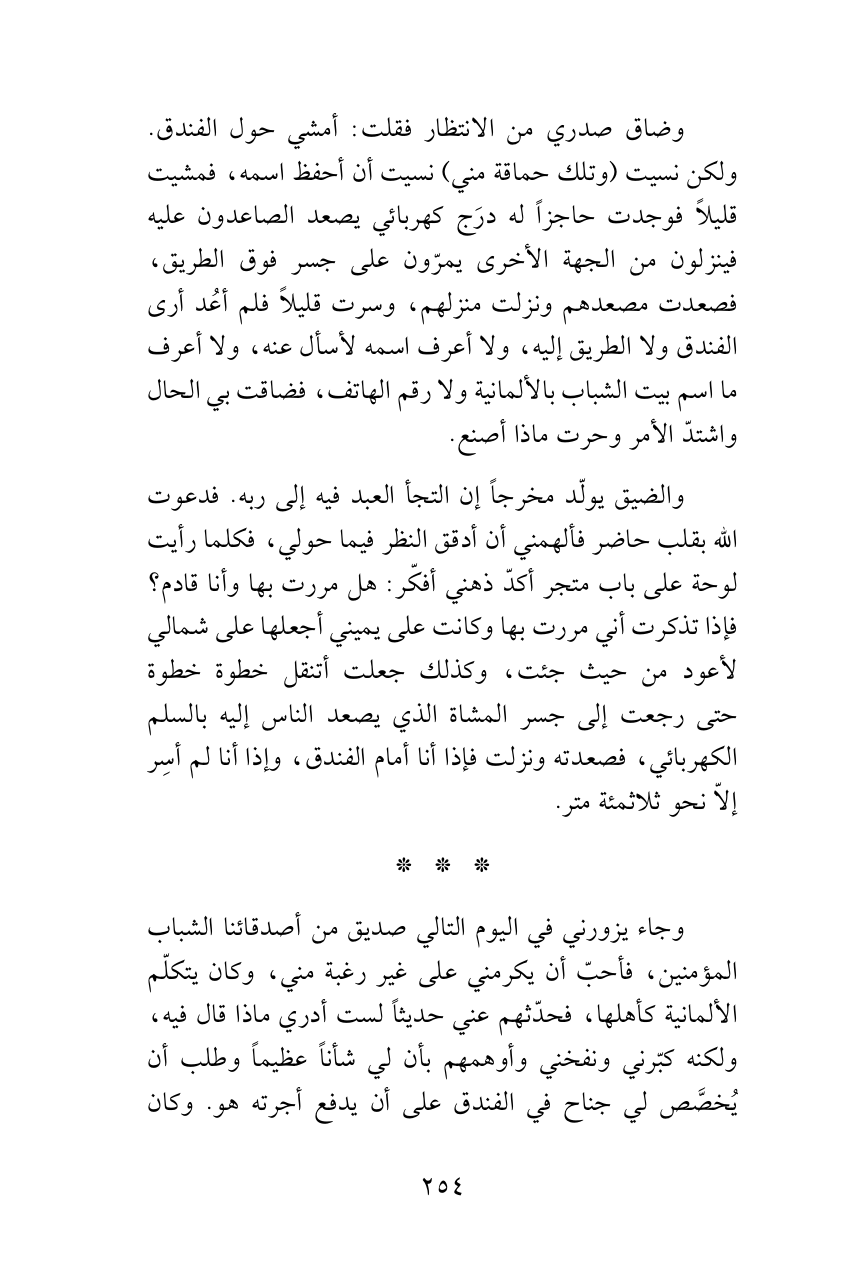 وضاق صدري من الانتظار فقلت: أمشي حول الفندق. ولكن نسيت (وتلك حماقة مني) نسيت أن أحفظ اسمه، فمشيت قليلاً فوجدت حاجزاً له درَج كهربائي يصعد الصاعدون عليه فينزلون من الجهة الأخرى يمرّون على جسر فوق الطريق، فصعدت مصعدهم ونزلت منزلهم، وسرت قليلاً فلم أعُد أرى الفندق ولا الطريق إليه، ولا أعرف اسمه لأسأل عنه، ولا أعرف ما اسم بيت الشباب بالألمانية ولا رقم الهاتف، فضاقت بي الحال واشتدّ الأمر وحرت ماذا أصنع.