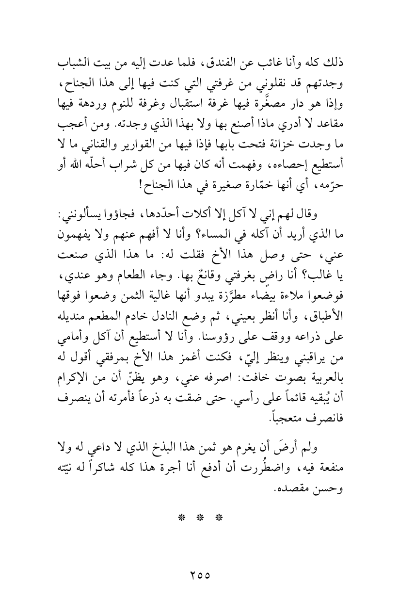 ذلك كله وأنا غائب عن الفندق، فلما عدت إليه من بيت الشباب وجدتهم قد نقلوني من غرفتي التي كنت فيها إلى هذا الجناح، وإذا هو دار مصغَّرة فيها غرفة استقبال وغرفة للنوم وردهة فيها مقاعد لا أدري ماذا أصنع بها ولا بهذا الذي وجدته. ومن أعجب ما وجدت خزانة فتحت بابها فإذا فيها من القوارير والقناني ما لا أستطيع إحصاءه، وفهمت أنه كان فيها من كل شراب أحلّه الله أو حرّمه، أي أنها خمّارة صغيرة في هذا الجناح!