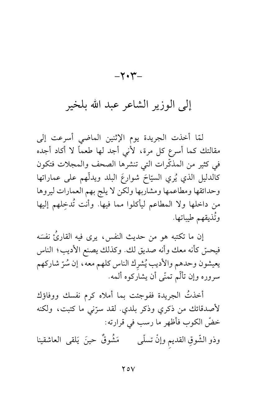 لمّا أخذت الجريدة يوم الإثنين الماضي أسرعت إلى مقالتك كما أسرع كل مرة، لأني أجد لها طعماً لا أكاد أجده في كثير من المذكّرات التي تنشرها الصحف والمجلات فتكون كالدليل الذي يُري السيّاحَ شوارعَ البلد ويدلّهم على عماراتها وحدائقها ومطاعمها ومشاربها ولكن لا يلج بهم العمارات ليروها من داخلها ولا المطاعم ليأكلوا مما فيها. وأنت تُدخِلهم إليها وتُذيقهم طيباتها.