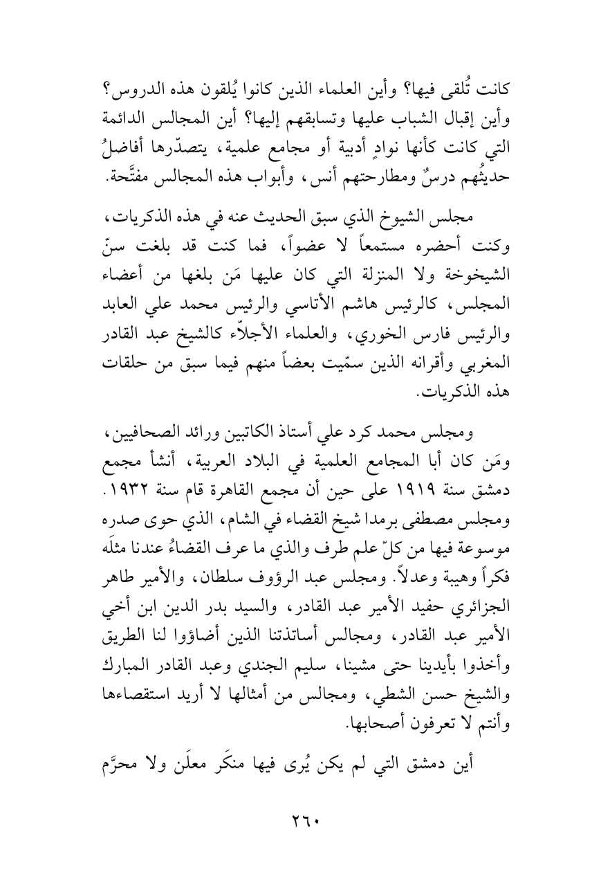 ومجلس محمد كرد علي أستاذ الكاتبين ورائد الصحافيين، ومَن كان أبا المجامع العلمية في البلاد العربية، أنشأ مجمع دمشق سنة 1919 على حين أن مجمع القاهرة قام سنة 1932. ومجلس مصطفى برمدا شيخ القضاء في الشام، الذي حوى صدره موسوعة فيها من كلّ علم طرف والذي ما عرف القضاءُ عندنا مثلَه فكراً وهيبة وعدلاً. ومجلس عبد الرؤوف سلطان، والأمير طاهر الجزائري حفيد الأمير عبد القادر، والسيد بدر الدين ابن أخي الأمير عبد القادر، ومجالس أساتذتنا الذين أضاؤوا لنا الطريق وأخذوا بأيدينا حتى مشينا، سليم الجندي وعبد القادر المبارك والشيخ حسن الشطي، ومجالس من أمثالها لا أريد استقصاءها وأنتم لا تعرفون أصحابها.