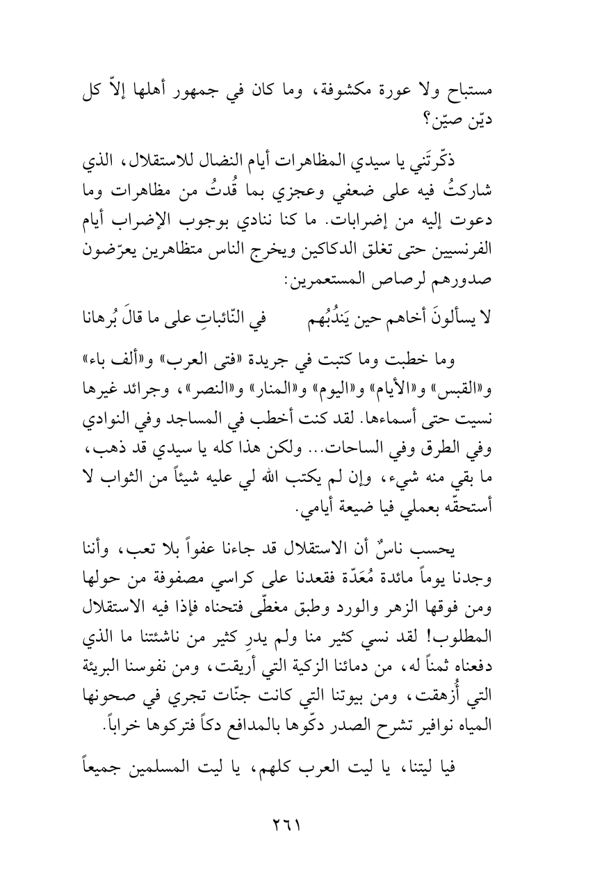 ذكّرتَني ياسيدي المظاهرات أيام النضال للاستقلال، الذي شاركتُ فيه على ضعفي وعجزي بما قُدتُ من مظاهرات وما دعوت إليه من إضرابات. ما كنا ننادي بوجوب الإضراب أيام الفرنسيين حتى تغلق الدكاكين ويخرج الناس متظاهرين يعرّضون صدورهم لرصاص المستعمرين: