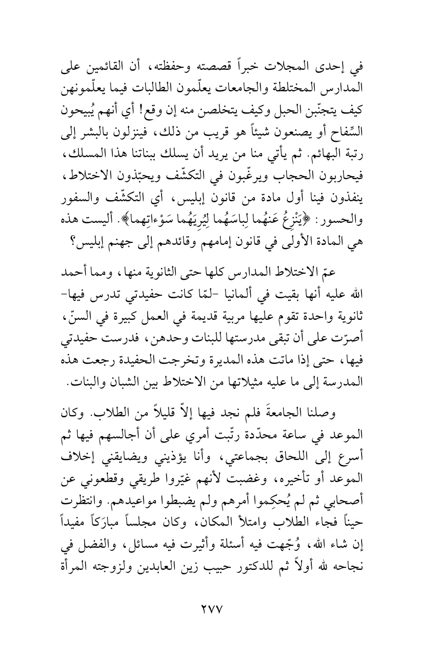 في إحدى المجلات خبراً قصصته وحفظته، أن القائمين على المدارس المختلطة والجامعات يعلّمون الطالبات فيما يعلّمونهن كيف يتجنّبن الحبل وكيف يتخلصن منه إن وقع! أي أنهم يُبيحون السِّفاح أو يصنعون شيئاً هو قريب من ذلك، فينزلون بالبشر إلى رتبة البهائم. ثم يأتي منا من يريد أن يسلك ببناتنا هذا المسلك، فيحاربون الحجاب ويرغّبون في التكشّف ويحبّذون الاختلاط، ينفذون فينا أول مادة من قانون إبليس، أي التكشّف والسفور والحسور: {يَنْزِعُ عَنهُما لِباسَهُما لِيُرِيَهُما سَوْءاتِهما}. أليست هذه هي المادة الأولى في قانون إمامهم وقائدهم إلى جهنم إبليس؟