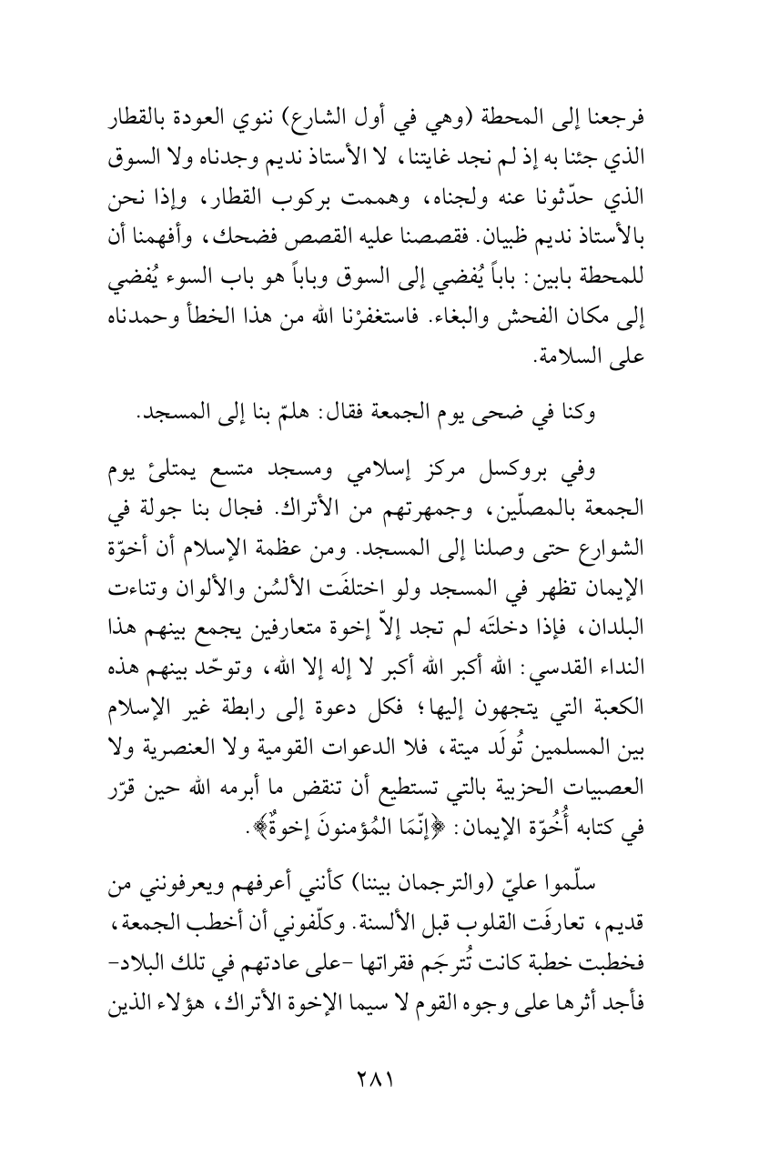 وفي بروكسل مركز إسلامي ومسجد متسع يمتلئ يوم الجمعة بالمصلّين، وجمهرتهم من الأتراك. فجال بنا جولة في الشوارع حتى وصلنا إلى المسجد. ومن عظمة الإسلام أن أخوّة الإيمان تظهر في المسجد ولو اختلفَت الألسُن والألوان وتناءت البلدان، فإذا دخلتَه لم تجد إلاّ إخوة متعارفين يجمع بينهم هذا النداء القدسي: الله أكبر الله أكبر لا إله إلا الله، وتوحّد بينهم هذه الكعبة التي يتجهون إليها؛ فكل دعوة إلى رابطة غير الإسلام بين المسلمين تُولَد ميتة، فلا الدعوات القومية ولا العنصرية ولا العصبيات الحزبية بالتي تستطيع أن تنقض ما أبرمه الله حين قرّر في كتابه أُخُوّة الإيمان: {إنّمَا المُؤمنونَ إخوةٌ}.