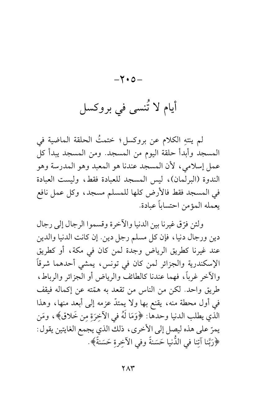 ولئن فرّق غيرنا بين الدنيا والآخرة وقسموا الرجال إلى رجال دين ورجال دنيا، فإن كل مسلم رجل دين. إن كانت الدنيا والدين عند غيرنا كطريق الرياض وجدة لمن كان في مكة، أو كطريق الإسكندرية والجزائر لمن كان في تونس، يمشي أحدهما شرقاً والآخر غرباً، فهما عندنا كالطائف والرياض أو الجزائر والرباط، طريق واحد. لكن من الناس من تقعد به همّته عن إكماله فيقف في أول محطة منه، يقنع بها ولا يمتدّ عزمه إلى أبعد منها، وهذا الذي يطلب الدنيا وحدها: {وَمَا لَهُ في الآخِرَةِ مِن خَلاق}، ومَن يمرّ على هذه ليصل إلى الأخرى، ذلك الذي يجمع الغايتين يقول: {رَبَّنا آتِنا في الدُّنيا حَسَنةً وفي الآخِرةِ حَسَنةً}.