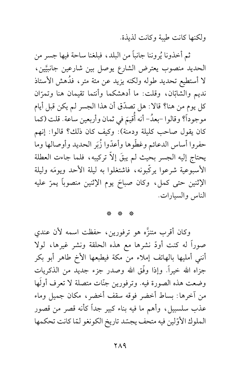 ثم أخذونا يُروننا جانباً من البلد، فبلغنا ساحة فيها جسر من الحديد منصوب يعترض الشارع يوصل بين شارعين جانبيَّين، لا أستطيع تحديد طوله ولكنه يزيد عن مئة متر، فدُهش الأستاذ نديم والشابّان، وقلت: ما أدهشكما وأنتما تقيمان هنا وتمرّان كل يوم من هنا؟ قالا: هل تصدّق أن هذا الجسر لم يكن قبل أيام موجوداً؟ وقالوا -بعدُ- أنه أُقيمَ في ثمان وأربعين ساعة. قلت (كما كان يقول صاحب كليلة ودمنة): وكيف كان ذلك؟ قالوا: إنهم حفروا أساس الدعائم وغطّوها وأعدّوا زُبَر الحديد وأوصالها وما يحتاج إليه الجسر بحيث لم يبقَ إلاّ تركيبه، فلما جاءت العطلة الأسبوعية شرعوا يركّبونه، فاشتغلوا به ليلة الأحد ويومَه وليلة الإثنين حتى كمل، وكان صباحَ يوم الإثنين منصوباً يمرّ عليه الناس والسيارات.