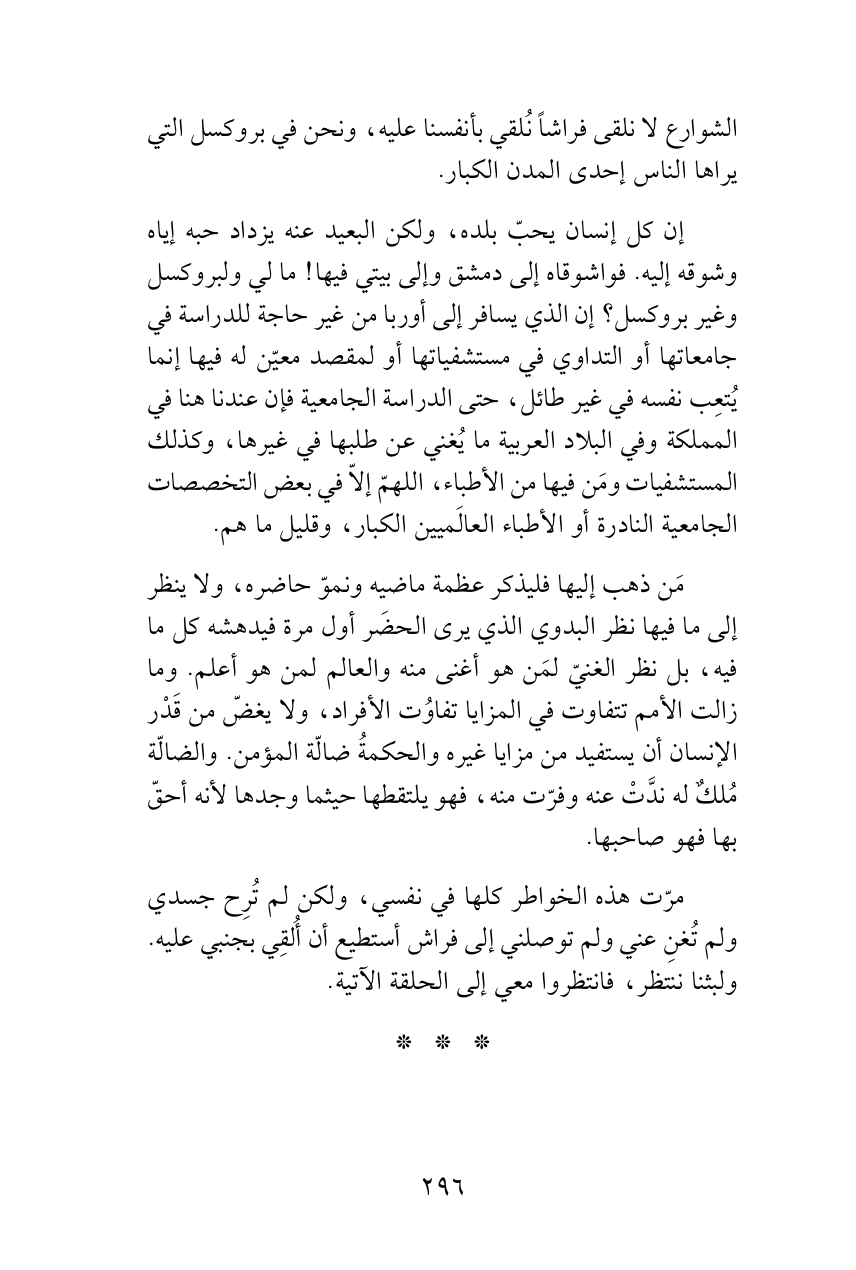 إن كل إنسان يحبّ بلده، ولكن البعيد عنه يزداد حبه إياه وشوقه إليه. فواشوقاه إلى دمشق وإلى بيتي فيها! ما لي ولبروكسل وغير بروكسل؟ إن الذي يسافر إلى أوربا من غير حاجة للدراسة في جامعاتها أو التداوي في مستشفياتها أو لمقصد معيّن له فيها إنما يُتعِب نفسه في غير طائل، حتى الدراسة الجامعية فإن عندنا هنا في المملكة وفي البلاد العربية ما يُغني عن طلبها في غيرها، وكذلك المستشفيات ومَن فيها من الأطباء، اللهمّ إلاّ في بعض التخصصات الجامعية النادرة أو الأطباء العالَميين الكبار، وقليل ما هم.