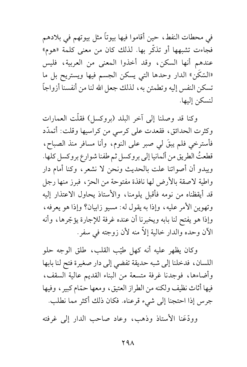 وكنا قد وصلنا إلى آخر البلد (بروكسل) فقلّت العمارات وكثرت الحدائق، فقعدت على كرسي من كراسيها وقلت: أتمدّد فأسترخي فلم يبقَ لي صبر على النوم، وأنا مسافر منذ الصباح، قطعتُ الطريق من ألمانيا إلى بروكسل ثم طفنا شوارع بروكسل كلها. ويبدو أن أصواتنا علت بالحديث ونحن لا نشعر، وكنا أمام دار واطية لاصقة بالأرض لها نافذة مفتوحة من الحرّ، فبرز منها رجل قد أيقظناه من نومه فأقبل يلومنا، والأستاذ يحاول الاعتذار إليه وتهوين الأمر عليه، وإذا به يقول له: مسيو زابيان؟ وإذا هو يعرفه، وإذا هو يفتح لنا بابه ويخبرنا أن عنده غرفة للإجارة يؤجّرها، وأنه الآن وحده والدار خالية إلاّ منه لأن زوجته في سفر.