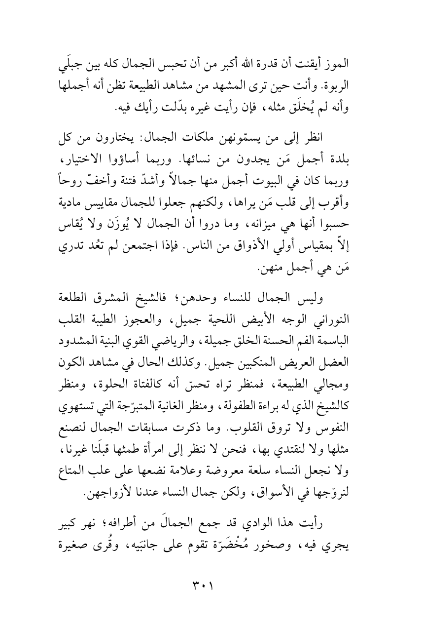 وليس الجمال للنساء وحدهن؛ فالشيخ المشرق الطلعة النوراني الوجه الأبيض اللحية جميل، والعجوز الطيبة القلب الباسمة الفم الحسنة الخلق جميلة، والرياضي القوي البنية المشدود العضل العريض المنكبين جميل. وكذلك الحال في مشاهد الكون ومجالي الطبيعة، فمنظر تراه تحسّ أنه كالفتاة الحلوة، ومنظر كالشيخ الذي له براءة الطفولة، ومنظر الغانية المتبرّجة التي تستهوي النفوس ولا تروق القلوب. وما ذكرت مسابقات الجمال لنصنع مثلها ولا لنقتدي بها، فنحن لا ننظر إلى امرأة طمثها قبلَنا غيرنا، ولا نجعل النساء سلعة معروضة وعلامة نضعها على علب المتاع لنروّجها في الأسواق، ولكن جمال النساء عندنا لأزواجهن.