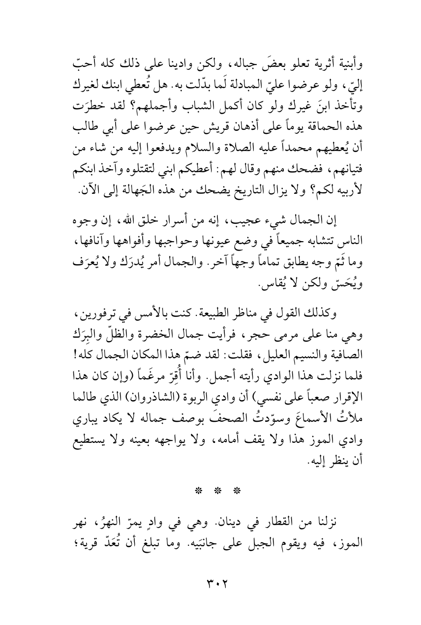 وأبنية أثرية تعلو بعضَ جباله، ولكن وادينا على ذلك كله أحبّ إليّ، ولو عرضوا عليّ المبادلة لَما بدّلت به. هل تُعطي ابنك لغيرك وتأخذ ابنَ غيرك ولو كان أكمل الشباب وأجملهم؟ لقد خطرَت هذه الحماقة يوماً على أذهان قريش حين عرضوا على أبي طالب أن يُعطيهم محمداً عليه الصلاة والسلام ويدفعوا إليه من شاء من فتيانهم، فضحك منهم وقال لهم: أعطيكم ابني لتقتلوه وآخذ ابنكم لأربيه لكم؟ ولا يزال التاريخ يضحك من هذه الجَهالة إلى الآن.