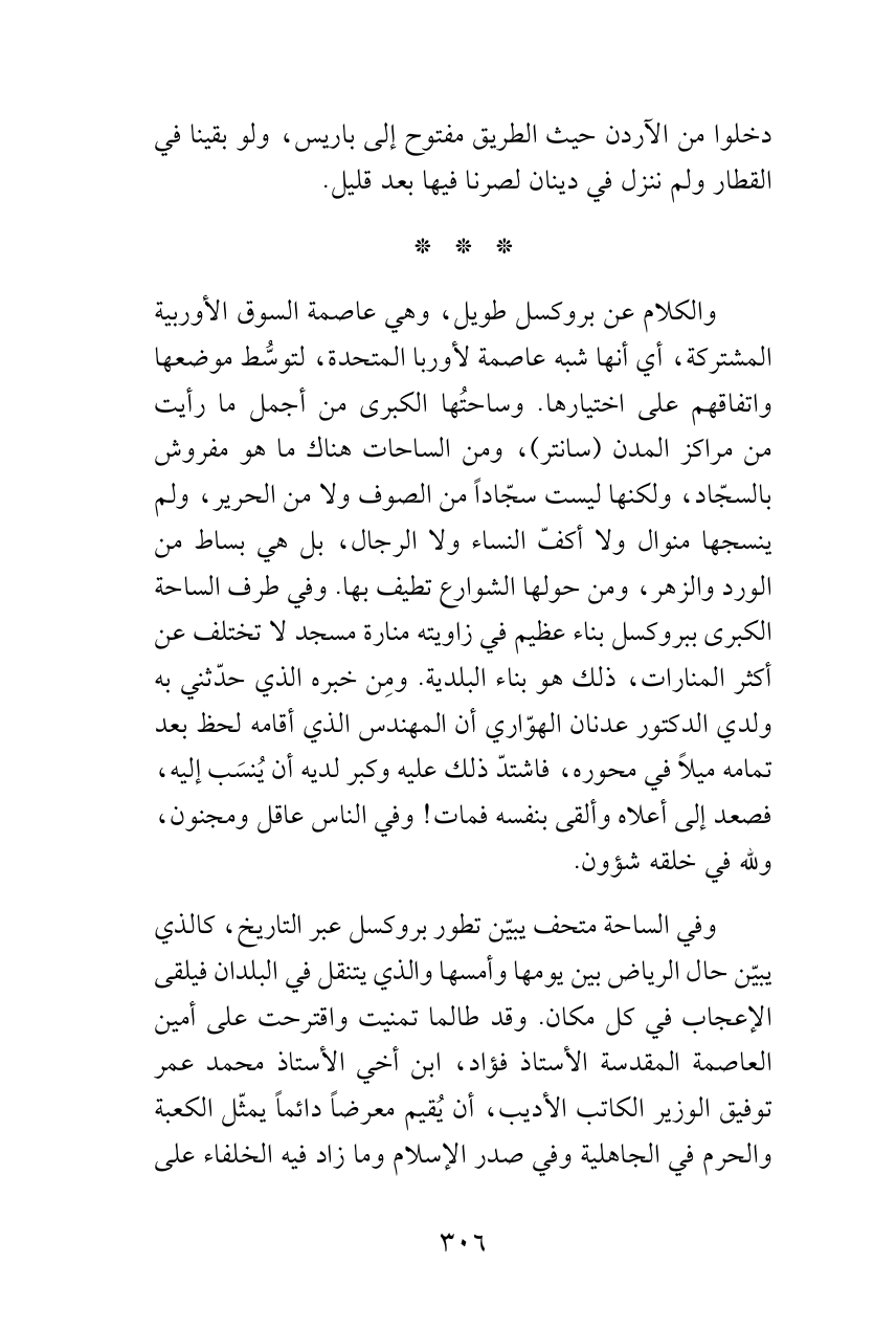 والكلام عن بروكسل طويل، وهي عاصمة السوق الأوربية المشتركة، أي أنها شبه عاصمة لأوربا المتحدة، لتوسُّط موضعها واتفاقهم على اختيارها. وساحتُها الكبرى من أجمل ما رأيت من مراكز المدن (سانتر)، ومن الساحات هناك ما هو مفروش بالسجّاد، ولكنها ليست سجّاداً من الصوف ولا من الحرير، ولم ينسجها منوال ولا أكفّ النساء ولا الرجال، بل هي بساط من الورد والزهر، ومن حولها الشوارع تطيف بها. وفي طرف الساحة الكبرى ببروكسل بناء عظيم في زاويته منارة مسجد لا تختلف عن أكثر المنارات، ذلك هو بناء البلدية. ومِن خبره الذي حدّثني به ولدي الدكتور عدنان الهوّاري أن المهندس الذي أقامه لحظ بعد تمامه ميلاً في محوره، فاشتدّ ذلك عليه وكبر لديه أن يُنسَب إليه، فصعد إلى أعلاه وألقى بنفسه فمات! وفي الناس عاقل ومجنون، ولله في خلقه شؤون.