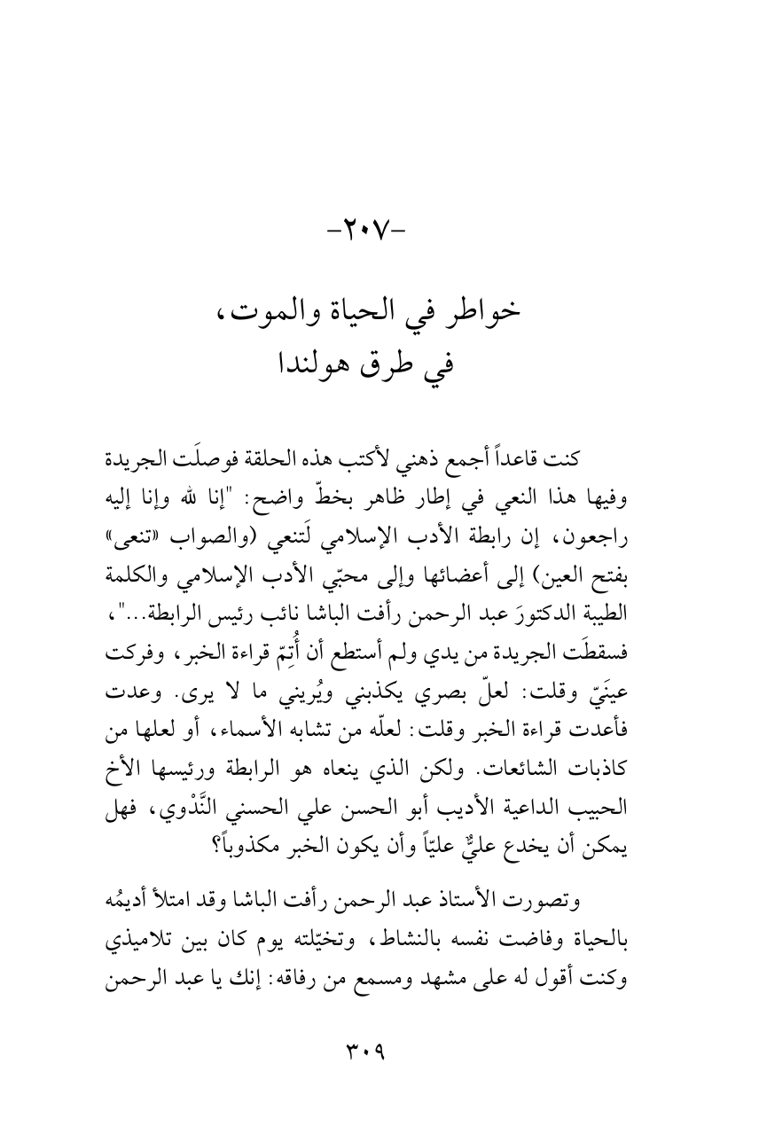 كنت قاعداً أجمع ذهني لأكتب هذه الحلقة فوصلَت الجريدة وفيها هذا النعي في إطار ظاهر بخطّ واضح: "إنا لله وإنا إليه راجعون، إن رابطة الأدب الإسلامي لَتنعي (والصواب «تنعى» بفتح العين) إلى أعضائها وإلى محبّي الأدب الإسلامي والكلمة الطيبة الدكتورَ عبد الرحمن رأفت الباشا نائب رئيس الرابطة ... "، فسقطَت الجريدة من يدي ولم أستطع أن أُتِمّ قراءة الخبر، وفركت عينَيّ وقلت: لعلّ بصري يكذبني ويُريني ما لا يرى. وعدت فأعدت قراءة الخبر وقلت: لعلّه من تشابه الأسماء، أو لعلها من كاذبات الشائعات. ولكن الذي ينعاه هو الرابطة ورئيسها الأخ الحبيب الداعية الأديب أبو الحسن علي الحسني النَّدْوي، فهل يمكن أن يخدع عليٌّ عليّاً وأن يكون الخبر مكذوباً؟