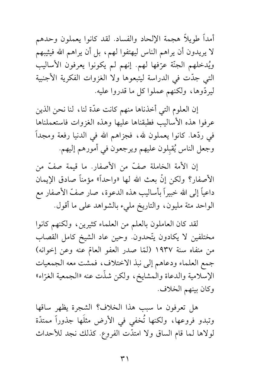 أمداً طويلاً هجمة الإلحاد والفساد. لقد كانوا يعملون وحدهم لا يريدون أن يراهم الناس ليهتفوا لهم، بل أن يراهم الله فيثيبهم ويُدخلهم الجنّة عرّفها لهم. إنهم لم يكونوا يعرفون الأساليب التي جدّت في الدراسة ليتبعوها ولا الغزوات الفكرية الأجنبية ليردّوها، ولكنهم عملوا كل ما قدروا عليه.