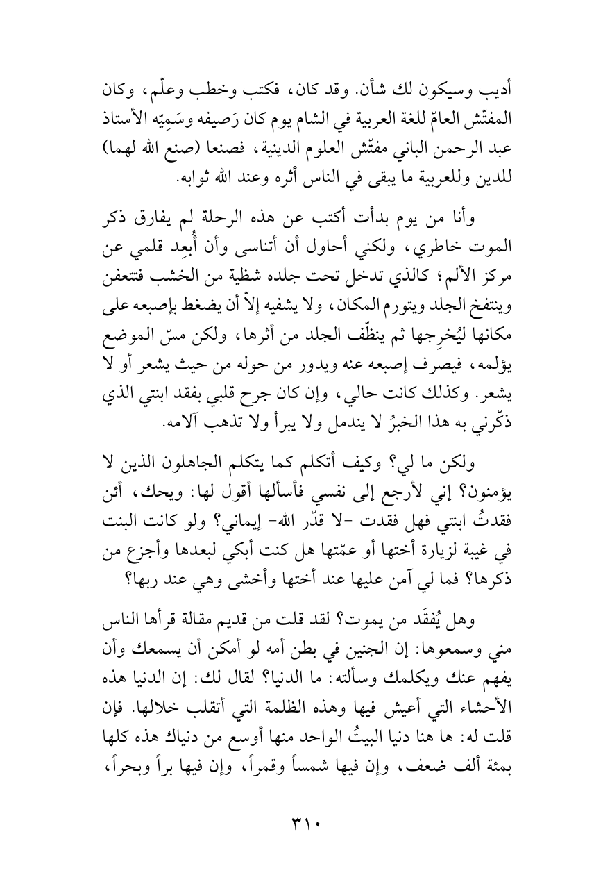ولكن ما لي؟ وكيف أتكلم كما يتكلم الجاهلون الذين لا يؤمنون؟ إني لأرجع إلى نفسي فأسألها أقول لها: ويحك، أئن فقدتُ ابنتي فهل فقدت -لا قدّر الله- إيماني؟ ولو كانت البنت في غيبة لزيارة أختها أو عمّتها هل كنت أبكي لبعدها وأجزع من ذكرها؟ فما لي آمن عليها عند أختها وأخشى وهي عند ربها؟