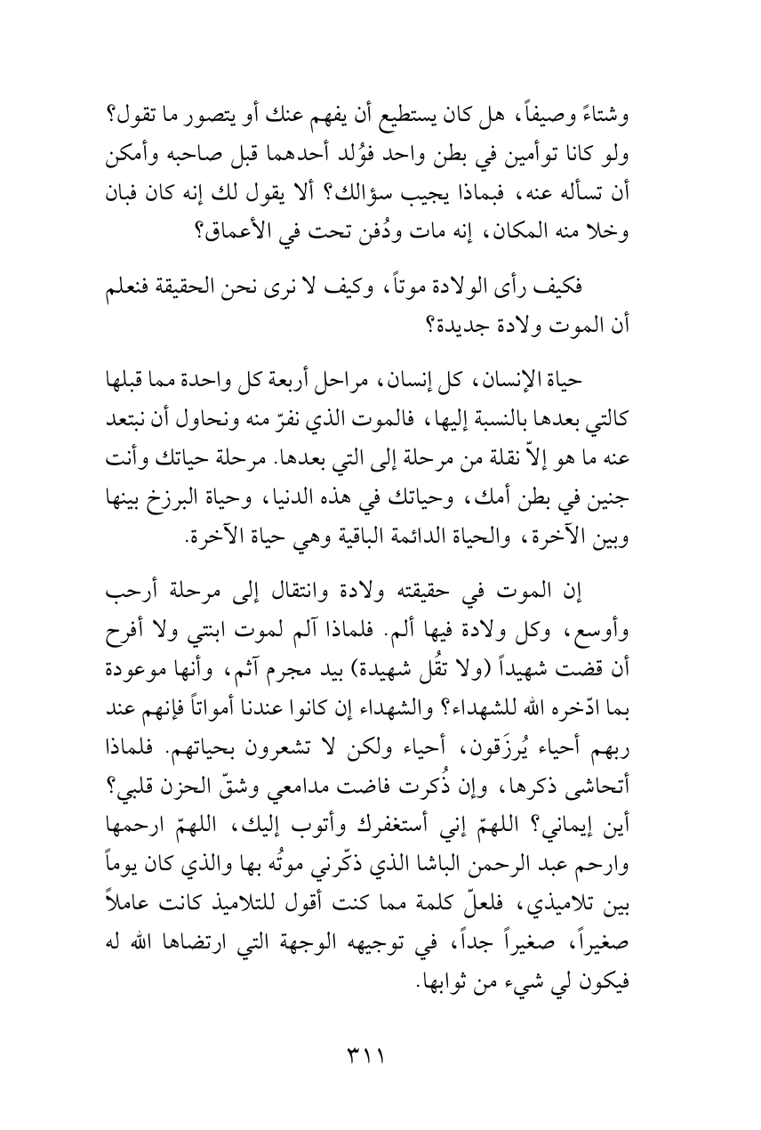 إن الموت في حقيقته ولادة وانتقال إلى مرحلة أرحب وأوسع، وكل ولادة فيها ألم. فلماذا آلم لموت ابنتي ولا أفرح أن قضت شهيداً (ولا تقُل شهيدة) بيد مجرم آثم، وأنها موعودة بما ادّخره الله للشهداء؟ والشهداء إن كانوا عندنا أمواتاً فإنهم عند ربهم أحياء يُرزَقون، أحياء ولكن لا تشعرون بحياتهم. فلماذا أتحاشى ذكرها، وإن ذُكرت فاضت مدامعي وشقّ الحزن قلبي؟ أين إيماني؟ اللهمّ إني أستغفرك وأتوب إليك، اللهمّ ارحمها وارحم عبد الرحمن الباشا الذي ذكّرني موتُه بها والذي كان يوماً بين تلاميذي، فلعلّ كلمة مما كنت أقول للتلاميذ كانت عاملاً صغيراً، صغيراً جداً، في توجيهه الوجهة التي ارتضاها الله له فيكون لي شيء من ثوابها.
