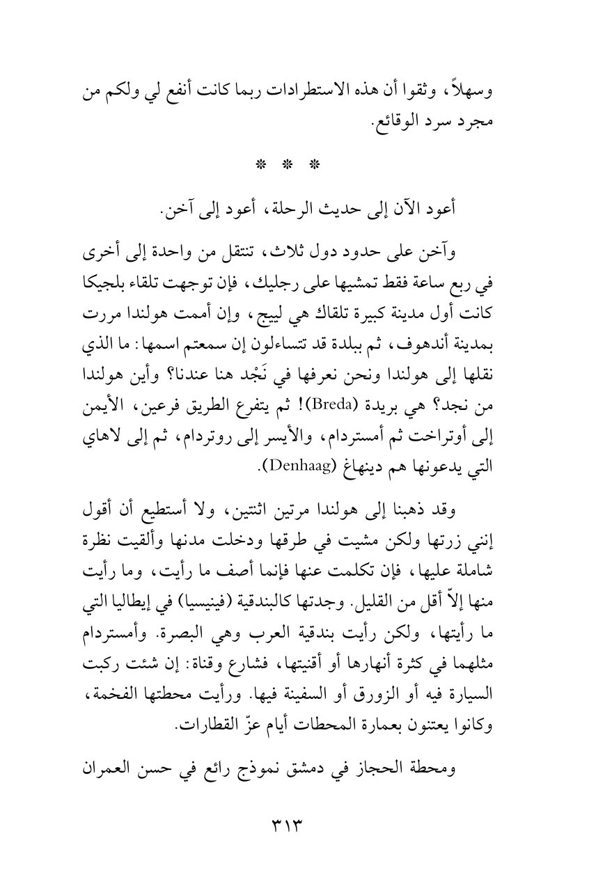 وقد ذهبنا إلى هولندا مرتين اثنتين، ولا أستطيع أن أقول إنني زرتها ولكن مشيت في طرقها ودخلت مدنها وألقيت نظرة شاملة عليها، فإن تكلمت عنها فإنما أصف ما رأيت، وما رأيت منها إلاّ أقل من القليل. وجدتها كالبندقية (فينيسيا) في إيطاليا التي ما رأيتها، ولكن رأيت بندقية العرب وهي البصرة. وأمستردام مثلهما في كثرة أنهارها أو أقنيتها، فشارع وقناة: إن شئت ركبت السيارة فيه أو الزورق أو السفينة فيها. ورأيت محطتها الفخمة، وكانوا يعتنون بعمارة المحطات أيام عزّ القطارات.