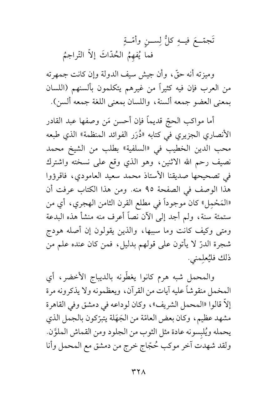 أما مواكب الحجّ قديماً فإن أحسن مَن وصفها عبد القادر الأنصاري الجزيري في كتابه «دُرَر الفوائد المنظمة» الذي طبعه محب الدين الخطيب في «السلفية» بطلب من الشيخ محمد نصيف رحم الله الاثنين، وهو الذي وقع على نسخته واشترك في تصحيحها صديقنا الأستاذ محمد سعيد العامودي، فاقرؤوا هذا الوصف في الصفحة 95 منه. ومن هذا الكتاب عرفت أن «المَحْمِل» كان موجوداً في مطلع القرن الثامن الهجري، أي من ستمئة سنة، ولم أجد إلى الآن نصاً أعرف منه منشأ هذه البدعة ومتى وكيف كانت وما سببها، والذين يقولون إن أصله هودج شجرة الدرّ لا يأتون على قولهم بدليل، فمن كان عنده علم من ذلك فليُعلِمني.