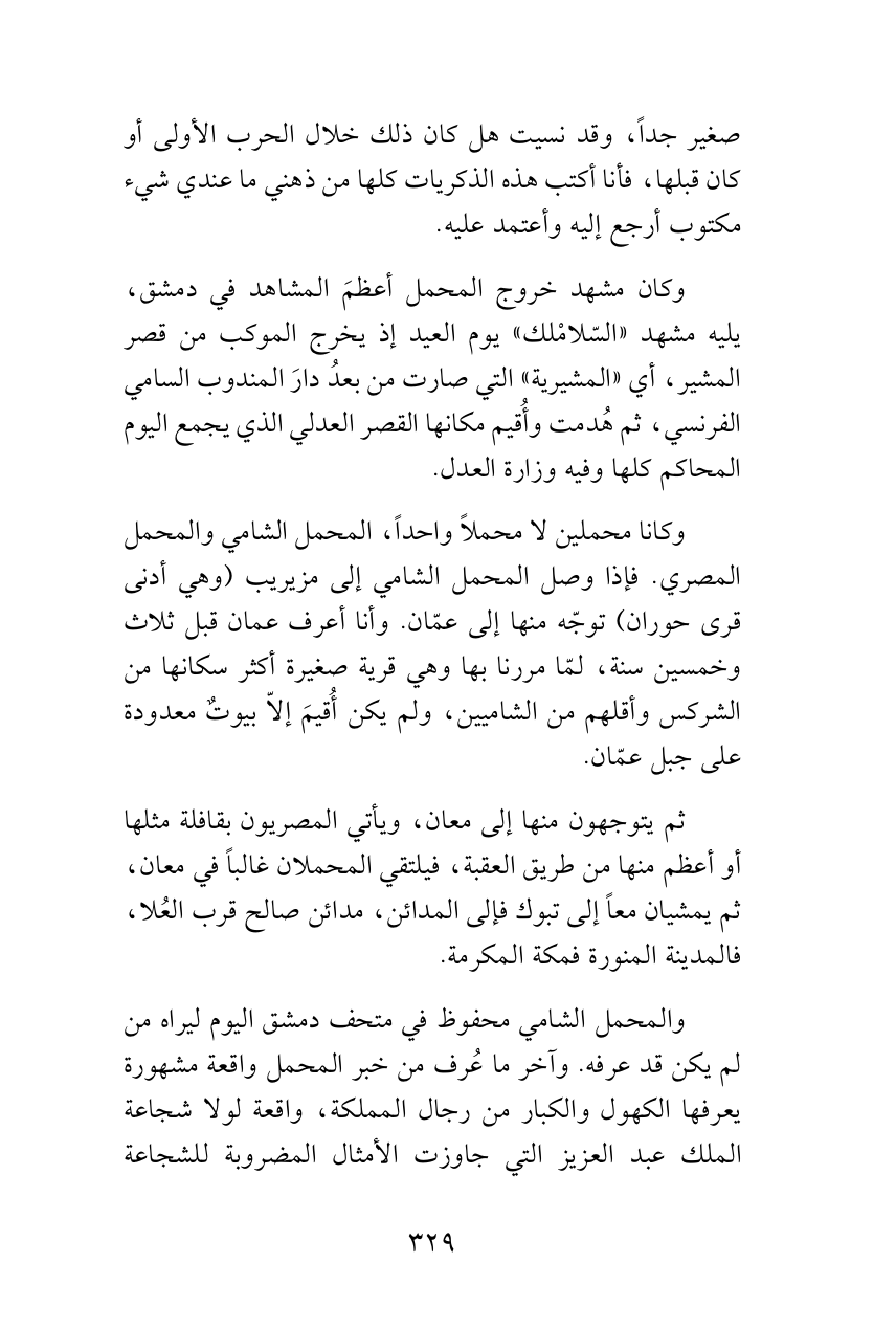 وكانا محملين لا محملاً واحداً، المحمل الشامي والمحمل المصري. فإذا وصل المحمل الشامي إلى مزيريب (وهي أدنى قرى حوران) توجّه منها إلى عمّان. وأنا أعرف عمان قبل ثلاث وخمسين سنة، لمّا مررنا بها وهي قرية صغيرة أكثر سكانها من الشركس وأقلهم من الشاميين، ولم يكن أُقيمَ إلاّ بيوتٌ معدودة على جبل عمّان.