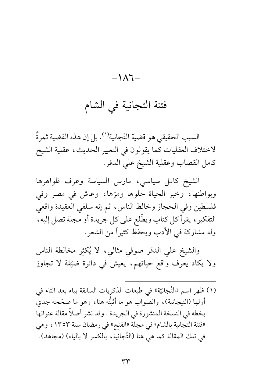 (¬1) ظهر اسم «التِّجانيّة» في طبعات الذكريات السابقة بياء بعد التاء في أولها (التيجانية)، والصواب هو ما أثبتُّه هنا، وهو ما صحّحه جدي بخطه في النسخة المنشورة في الجريدة. وقد نشر أصلاً مقالة عنوانها «فتنة التجانية بالشام» في مجلة «الفتح» في رمضان سنة 1353، وهي في تلك المقالة كما هي هنا (التِّجانية، بالكسر لا بالياء) (مجاهد).