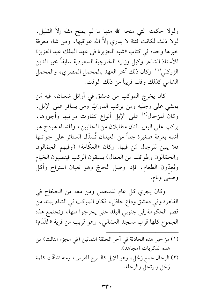 ولولا حكمته التي منحه الله منها ما لم يمنح مثله إلاّ القليل، لولا ذلك لكانت فتنة لا يدري إلاّ الله عواقبها، ومن شاء معرفة خبرها وجده في كتاب «شبه الجزيرة في عهد الملك عبد العزيز» للأستاذ الشاعر وكيل وزارة الخارجية السعودية سابقاً خير الدين الزركلي (¬1). وكان ذلك آخر العهد بالمحمل المصري، والمحمل الشامي كذلك وقف قريباً من ذلك الوقت.