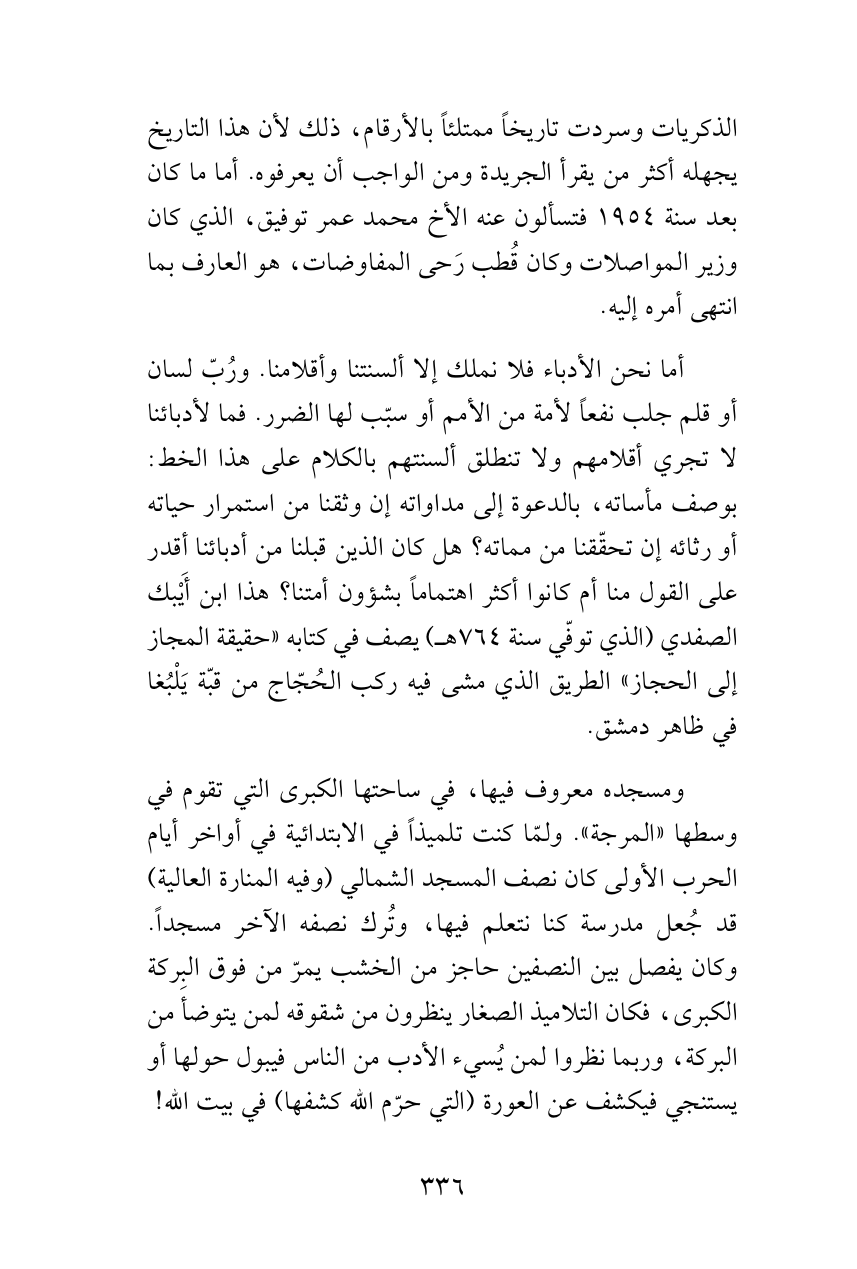 أما نحن الأدباء فلا نملك إلا ألسنتنا وأقلامنا. ورُبّ لسان أو قلم جلب نفعاً لأمة من الأمم أو سبّب لها الضرر. فما لأدبائنا لا تجري أقلامهم ولا تنطلق ألسنتهم بالكلام على هذا الخط: بوصف مأساته، بالدعوة إلى مداواته إن وثقنا من استمرار حياته أو رثائه إن تحقّقنا من مماته؟ هل كان الذين قبلنا من أدبائنا أقدر على القول منا أم كانوا أكثر اهتماماً بشؤون أمتنا؟ هذا ابن أَيْبك الصفدي (الذي توفّي سنة 764هـ) يصف في كتابه «حقيقة المجاز إلى الحجاز» الطريق الذي مشى فيه ركب الحُجّاج من قبّة يَلْبُغا في ظاهر دمشق.