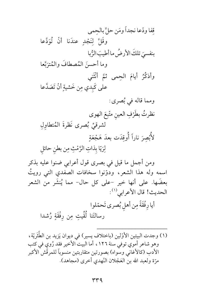 ومن أجمل ما قيل في بصرى قول أعرابي ضنوا عليه بذكر اسمه وله هذا الشعر، ودوّنوا سخافات الصفدي التي رويتُ بعضَها. على أنها خير -على كل حال- مما يُنشَر من الشعر الحديث! قال الأعرابي (¬1):