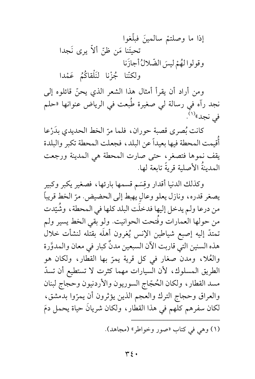ومن أراد أن يقرأ أمثال هذا الشعر الذي يحنّ قائلوه إلى نجد رآه في رسالة لي صغيرة طُبعت في الرياض عنوانها «حلم في نجد» (¬1).