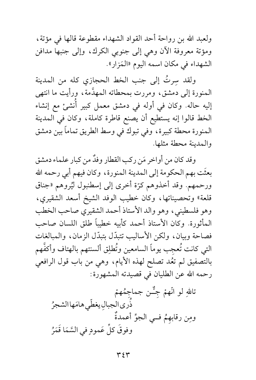 وقد كان من أواخر مَن ركب القطار وفدٌ من كبار علماء دمشق بعثَت بهم الحكومة إلى المدينة المنورة، وكان فيهم أبي رحمه الله ورحمهم. وقد أخذوهم كرّة أخرى إلى إسطنبول ليُروهم «جناق قلعة» وتحصيناتها، وكان خطيب الوفد الشيخ أسعد الشقيري، وهو فلسطيني، وهو والد الأستاذ أحمد الشقيري صاحب الخطب المأثورة. وكان الأستاذ أحمد كأبيه خطيباً طلق اللسان صاحب فصاحة وبيان، ولكن الأساليب تتبدّل بتبدّل الزمان، والمبالغات التي كانت تُعجِب يوماً السامعين وتُطلِق ألسنتهم بالهتاف وأكفَّهم بالتصفيق لم تعُد تصلح لهذه الأيام، وهي من باب قول الرافعي رحمه الله عن الطليان في قصيدته المشهورة: