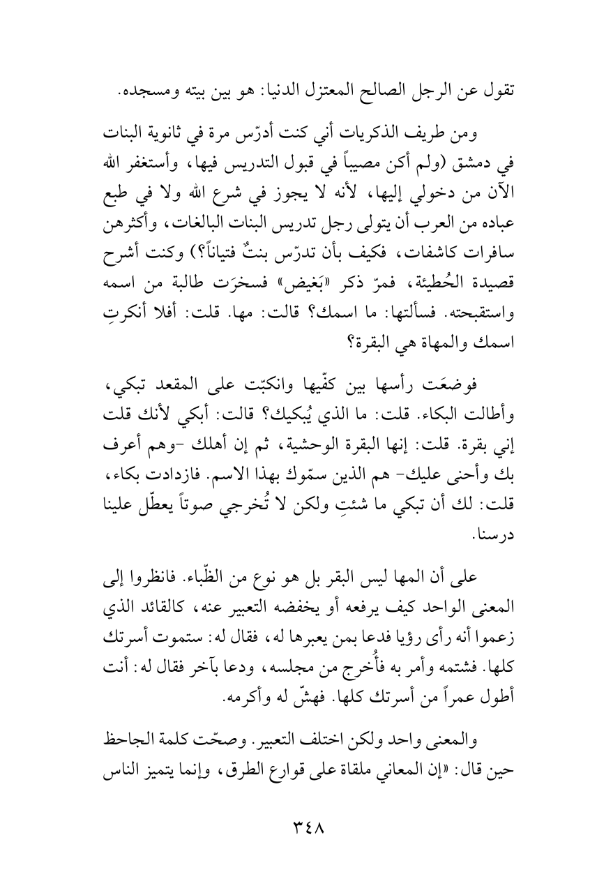 ومن طريف الذكريات أني كنت أدرّس مرة في ثانوية البنات في دمشق (ولم أكن مصيباً في قبول التدريس فيها، وأستغفر الله الآن من دخولي إليها، لأنه لا يجوز في شرع الله ولا في طبع عباده من العرب أن يتولى رجل تدريس البنات البالغات، وأكثرهن سافرات كاشفات، فكيف بأن تدرّس بنتٌ فتياناً؟) وكنت أشرح قصيدة الحُطيئة، فمرّ ذكر «بَغيض» فسخرَت طالبة من اسمه واستقبحته. فسألتها: ما اسمك؟ قالت: مها. قلت: أفلا أنكرتِ اسمك والمهاة هي البقرة؟
