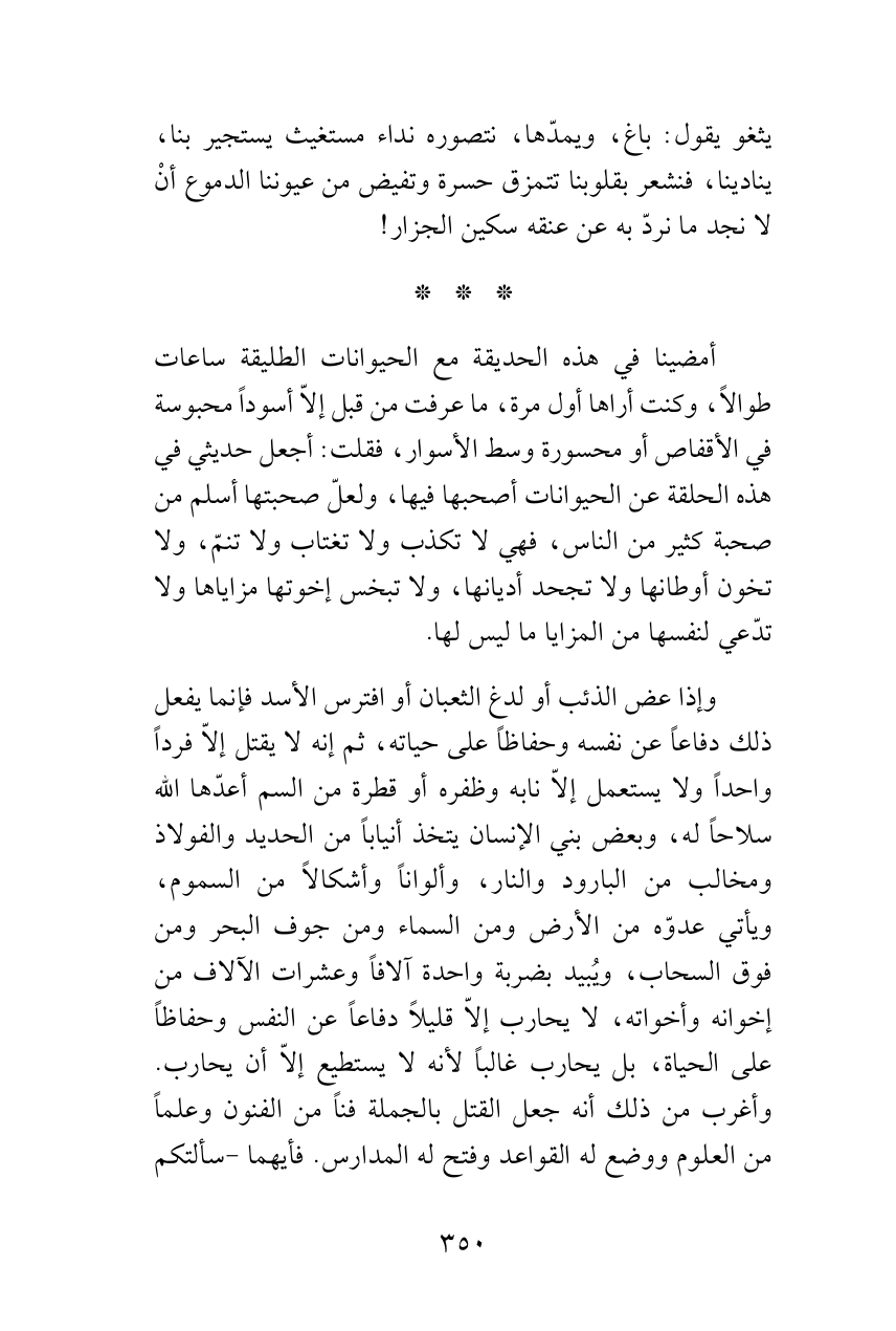 وإذا عض الذئب أو لدغ الثعبان أو افترس الأسد فإنما يفعل ذلك دفاعاً عن نفسه وحفاظاً على حياته، ثم إنه لا يقتل إلاّ فرداً واحداً ولا يستعمل إلاّ نابه وظفره أو قطرة من السم أعدّها الله سلاحاً له، وبعض بني الإنسان يتخذ أنياباً من الحديد والفولاذ ومخالب من البارود والنار، وألواناً وأشكالاً من السموم، ويأتي عدوّه من الأرض ومن السماء ومن جوف البحر ومن فوق السحاب، ويُبيد بضربة واحدة آلافاً وعشرات الآلاف من إخوانه وأخواته، لا يحارب إلاّ قليلاً دفاعاً عن النفس وحفاظاً على الحياة، بل يحارب غالباً لأنه لا يستطيع إلاّ أن يحارب. وأغرب من ذلك أنه جعل القتل بالجملة فناً من الفنون وعلماً من العلوم ووضع له القواعد وفتح له المدارس. فأيهما -سألتكم