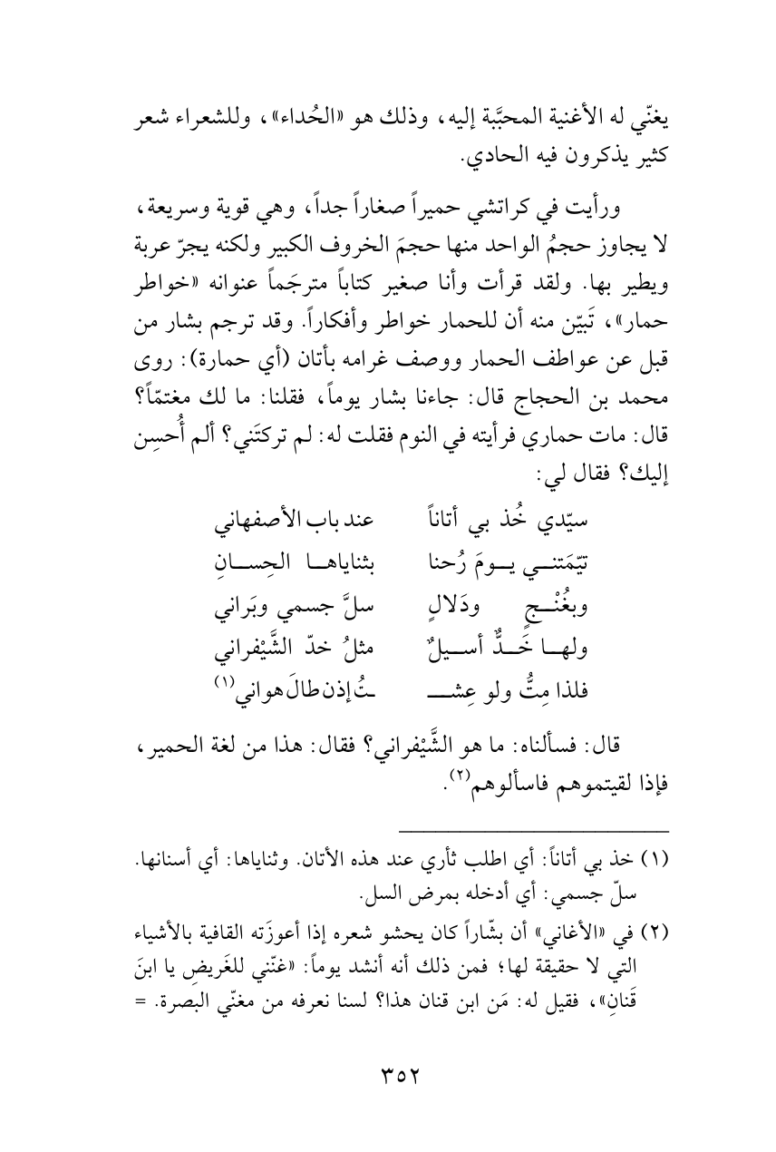 ورأيت في كراتشي حميراً صغاراً جداً، وهي قوية وسريعة، لا يجاوز حجمُ الواحد منها حجمَ الخروف الكبير ولكنه يجرّ عربة ويطير بها. ولقد قرأت وأنا صغير كتاباً مترجَماً عنوانه «خواطر حمار»، تَبيّن منه أن للحمار خواطر وأفكاراً. وقد ترجم بشار من قبل عن عواطف الحمار ووصف غرامه بأتان (أي حمارة): روى محمدبن الحجاج قال: جاءنا بشار يوماً، فقلنا: ما لك مغتمّاً؟ قال: مات حماري فرأيته في النوم فقلت له: لم تركتَني؟ ألم أُحسِن إليك؟ فقال لي: