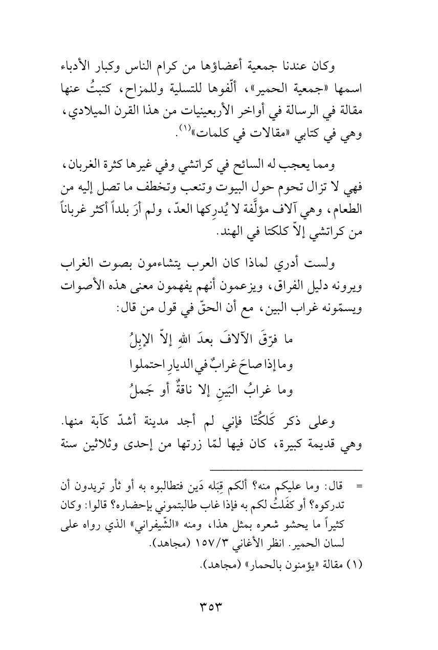 وكان عندنا جمعية أعضاؤها من كرام الناس وكبار الأدباء اسمها «جمعية الحمير»، ألّفوها للتسلية وللمزاح، كتبتُ عنها مقالة في الرسالة في أواخر الأربعينيات من هذا القرن الميلادي، وهي في كتابي «مقالات في كلمات» (¬1).