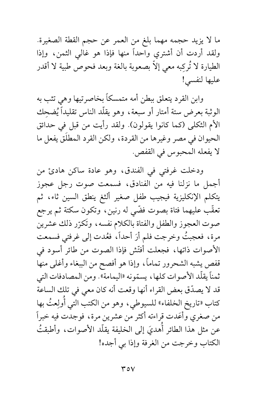 ودخلت غرفتي في الفندق، وهو عادة ساكن هادئ من أجمل ما نزلنا فيه من الفنادق، فسمعت صوت رجل عجوز يتكلم الإنكليزية فيجيب طفل صغير ألثغ ينطق السين ثاء، ثم تعقّب عليهما فتاة بصوت فضّي له رنين، وتكون سكتة ثم يرجع صوت العجوز والطفل والفتاة بالكلام نفسه، وتَكرّر ذلك عشرين مرة، فعجبتُ وخرجت فلم أرَ أحداً، فعُدت إلى غرفتي فسمعت الأصوات ذاتها، فجعلت أفتّش فإذا الصوت من طائر أسود في قفص يشبه الشحرور تماماً، وإذا هو أفصح من الببغاء وأغلى منها ثمناً يقلّد الأصوات كلها، يسمّونه «اليمامة». ومن المصادفات التي قد لا يصدّق بعض القراء أنها وقعت أنه كان معي في تلك الساعة كتاب «تاريخ الخلفاء» للسيوطي، وهو من الكتب التي أُولِعتُ بها من صغري وأعَدت قراءته أكثر من عشرين مرة، فوجدت فيه خبراً عن مثل هذا الطائر أُهديَ إلى الخليفة يقلّد الأصوات، وأطبقتُ الكتاب وخرجت من الغرفة وإذا بي أجده!