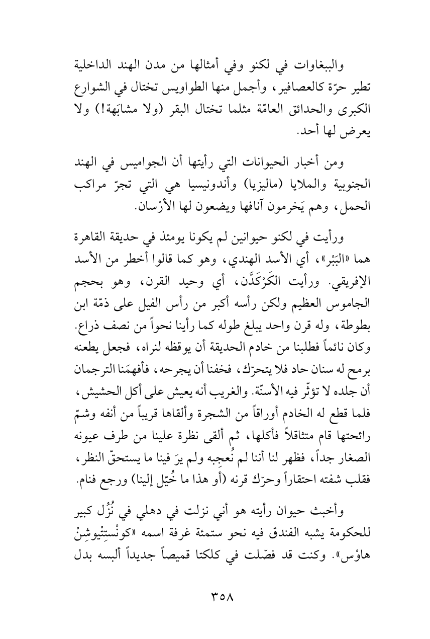 ورأيت في لكنو حيوانين لم يكونا يومئذ في حديقة القاهرة هما «البَبْر»، أي الأسد الهندي، وهو كما قالوا أخطر من الأسد الإفريقي. ورأيت الكَرْكَدَّن، أي وحيد القرن، وهو بحجم الجاموس العظيم ولكن رأسه أكبر من رأس الفيل على ذمّة ابن بطوطة، وله قرن واحد يبلغ طوله كما رأينا نحواً من نصف ذراع. وكان نائماً فطلبنا من خادم الحديقة أن يوقظه لنراه، فجعل يطعنه برمح له سنان حاد فلا يتحرّك، فخفنا أن يجرحه، فأفهمَنا الترجمان أن جلده لا تؤثّر فيه الأسنّة. والغريب أنه يعيش على أكل الحشيش، فلما قطع له الخادم أوراقاً من الشجرة وألقاها قريباً من أنفه وشمّ رائحتها قام متثاقلاً فأكلها، ثم ألقى نظرة علينا من طرف عيونه الصغار جداً، فظهر لنا أننا لم نُعجِبه ولم يرَ فينا ما يستحقّ النظر، فقلب شفته احتقاراً وحرّك قرنه (أو هذا ما خُيّل إلينا) ورجع فنام.