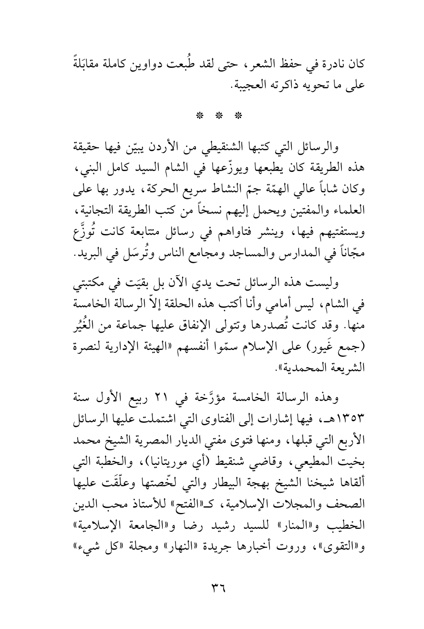 والرسائل التي كتبها الشنقيطي من الأردن يبيّن فيها حقيقة هذه الطريقة كان يطبعها ويوزّعها في الشام السيد كامل البني، وكان شاباً عالي الهمّة جمّ النشاط سريع الحركة، يدور بها على العلماء والمفتين ويحمل إليهم نسخاً من كتب الطريقة التجانية، ويستفتيهم فيها، وينشر فتاواهم في رسائل متتابعة كانت تُوزَّع مجّاناً في المدارس والمساجد ومجامع الناس وتُرسَل في البريد.
