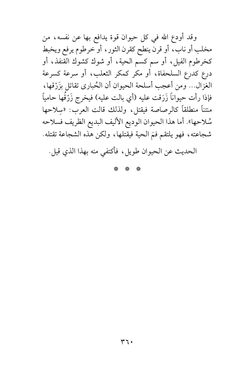 وقد أودع الله في كل حيوان قوة يدافع بها عن نفسه، من مخلب أو ناب، أو قرن ينطح كقرن الثور، أو خرطوم يرفع ويخبط كخرطوم الفيل، أو سم كسم الحية، أو شوك كشوك القنفذ، أو درع كدرع السلحفاة، أو مكر كمكر الثعلب، أو سرعة كسرعة الغزال ... ومن أعجب أسلحة الحيوان أن الحُبارى تقاتل بزَرْقها، فإذا رأت حيواناً زَرَقت عليه (أي بالت عليه) فيخرج زَرْقُها حامياً منتناً منطلقاً كالرصاصة فيقتل، ولذلك قالت العرب: «سِلاحها سُلاحها». أما هذا الحيوان الوديع الأليف البديع الظريف فسلاحه شجاعته، فهو يلتقم فمَ الحية فيقتلها، ولكن هذه الشجاعة تقتله.