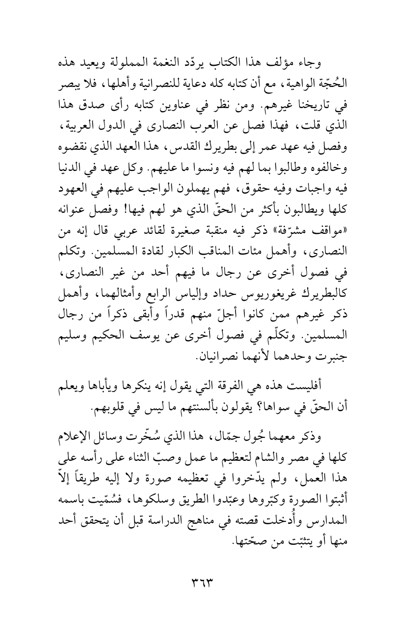 وجاء مؤلف هذا الكتاب يردّد النغمة المملولة ويعيد هذه الحُجّة الواهية، مع أن كتابه كله دعاية للنصرانية وأهلها، فلا يبصر في تاريخنا غيرهم. ومن نظر في عناوين كتابه رأى صدق هذا الذي قلت، فهذا فصل عن العرب النصارى في الدول العربية، وفصل فيه عهد عمر إلى بطريرك القدس، هذا العهد الذي نقضوه وخالفوه وطالبوا بما لهم فيه ونسوا ما عليهم. وكل عهد في الدنيا فيه واجبات وفيه حقوق، فهم يهملون الواجب عليهم في العهود كلها ويطالبون بأكثر من الحقّ الذي هو لهم فيها! وفصل عنوانه «مواقف مشرّفة» ذكر فيه منقبة صغيرة لقائد عربي قال إنه من النصارى، وأهمل مئات المناقب الكبار لقادة المسلمين. وتكلم في فصول أخرى عن رجال ما فيهم أحد من غير النصارى، كالبطريرك غريغوريوس حداد وإلياس الرابع وأمثالهما، وأهمل ذكر غيرهم ممن كانوا أجلّ منهم قدراً وأبقى ذكراً من رجال المسلمين. وتكلّم في فصول أخرى عن يوسف الحكيم وسليم جنبرت وحدهما لأنهما نصرانيان.