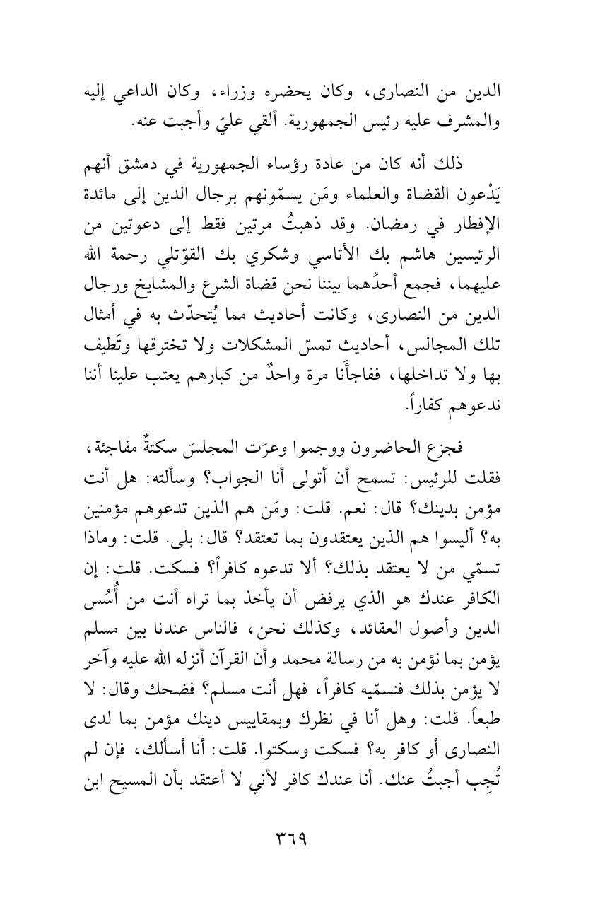 ذلك أنه كان من عادة رؤساء الجمهورية في دمشق أنهم يَدْعون القضاة والعلماء ومَن يسمّونهم برجال الدين إلى مائدة الإفطار في رمضان. وقد ذهبتُ مرتين فقط إلى دعوتين من الرئيسين هاشم بك الأتاسي وشكري بك القوّتلي رحمة الله عليهما، فجمع أحدُهما بيننا نحن قضاة الشرع والمشايخ ورجال الدين من النصارى، وكانت أحاديث مما يُتحدّث به في أمثال تلك المجالس، أحاديث تمسّ المشكلات ولا تخترقها وتَطيف بها ولا تداخلها، ففاجأَنا مرة واحدٌ من كبارهم يعتب علينا أننا ندعوهم كفاراً.