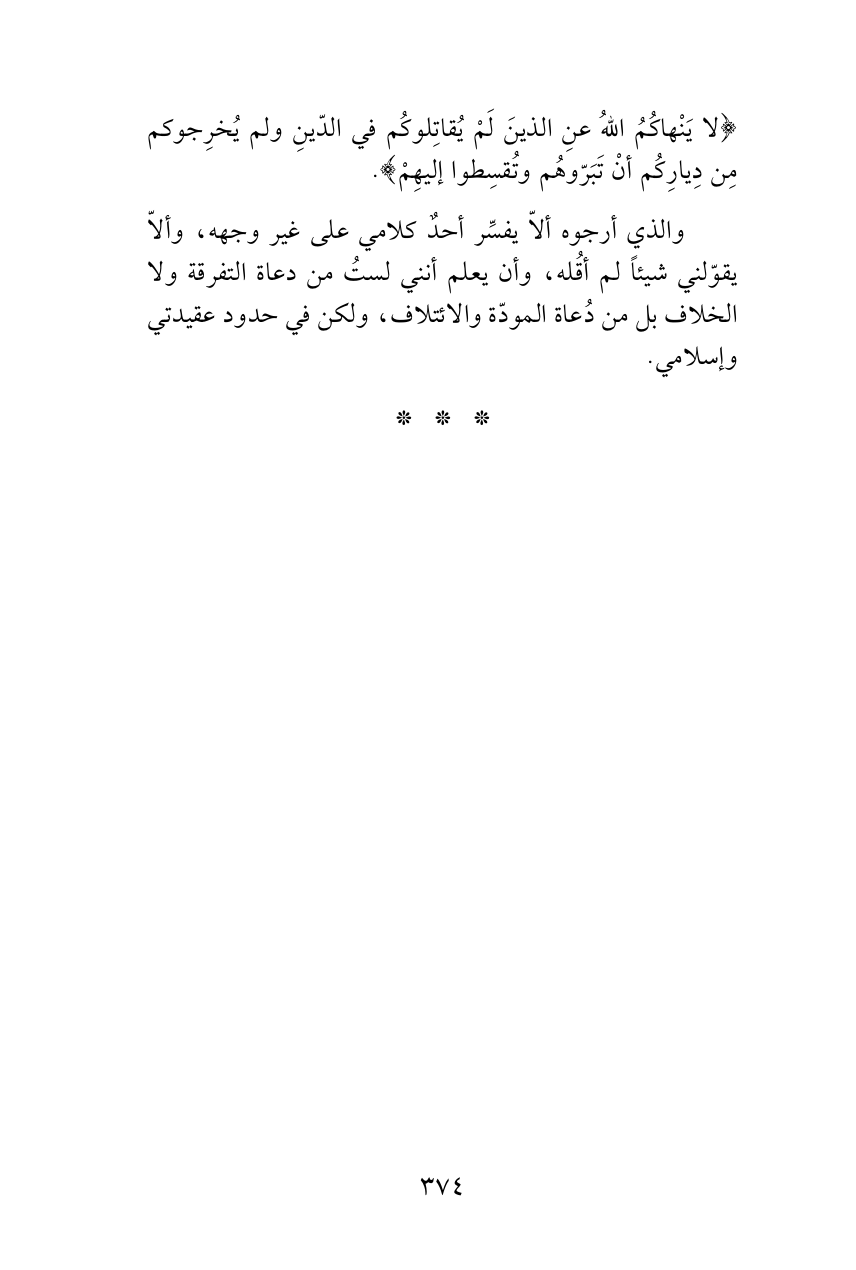 والذي أرجوه ألاّ يفسِّر أحدٌ كلامي على غير وجهه، وألاّ يقوّلني شيئاً لم أقُله، وأن يعلم أنني لستُ من دعاة التفرقة ولا الخلاف بل من دُعاة المودّة والائتلاف، ولكن في حدود عقيدتي وإسلامي.