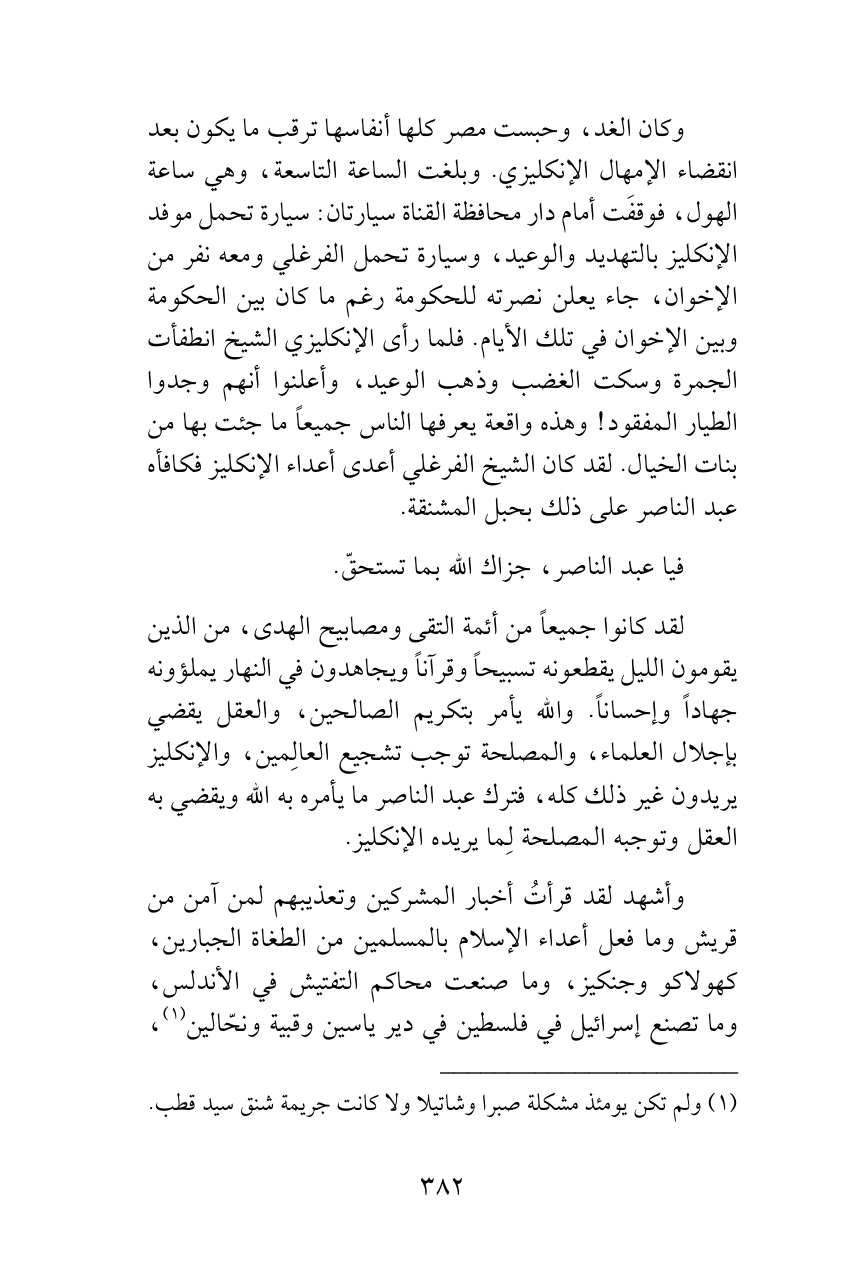 وكان الغد، وحبست مصر كلها أنفاسها ترقب ما يكون بعد انقضاء الإمهال الإنكليزي. وبلغت الساعة التاسعة، وهي ساعة الهول، فوقفَت أمام دار محافظة القناة سيارتان: سيارة تحمل موفد الإنكليز بالتهديد والوعيد، وسيارة تحمل الفرغلي ومعه نفر من الإخوان، جاء يعلن نصرته للحكومة رغم ما كان بين الحكومة وبين الإخوان في تلك الأيام. فلما رأى الإنكليزي الشيخ انطفأت الجمرة وسكت الغضب وذهب الوعيد، وأعلنوا أنهم وجدوا الطيار المفقود! وهذه واقعة يعرفها الناس جميعاً ما جئت بها من بنات الخيال. لقد كان الشيخ الفرغلي أعدى أعداء الإنكليز فكافأه عبد الناصر على ذلك بحبل المشنقة.