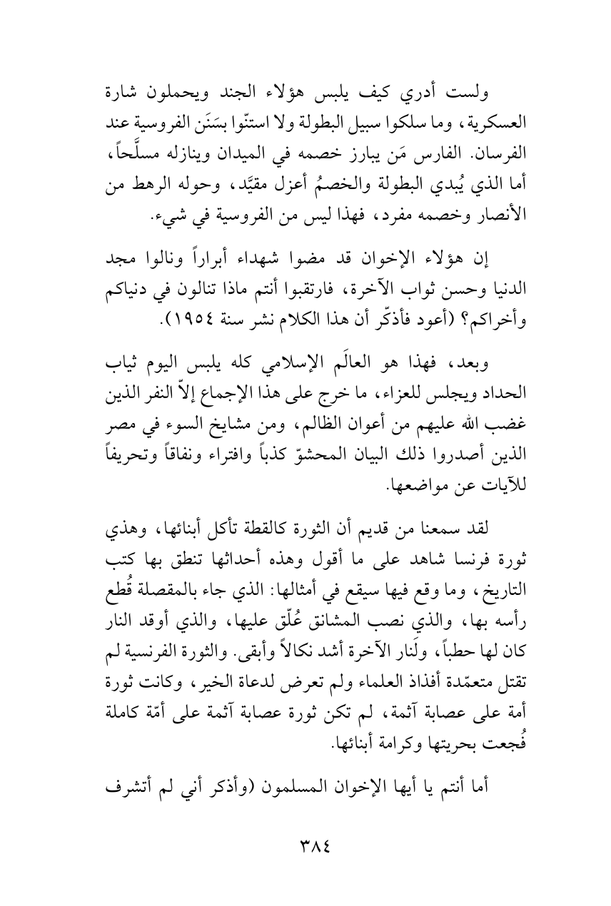 لقد سمعنا من قديم أن الثورة كالقطة تأكل أبنائها، وهذي ثورة فرنسا شاهد على ما أقول وهذه أحداثها تنطق بها كتب التاريخ، وما وقع فيها سيقع في أمثالها: الذي جاء بالمقصلة قُطع رأسه بها، والذي نصب المشانق عُلّق عليها، والذي أوقد النار كان لها حطباً، ولَنار الآخرة أشد نكالاً وأبقى. والثورة الفرنسية لم تقتل متعمّدة أفذاذ العلماء ولم تعرض لدعاة الخير، وكانت ثورة أمة على عصابة آثمة، لم تكن ثورة عصابة آثمة على أمّة كاملة فُجعت بحريتها وكرامة أبنائها.