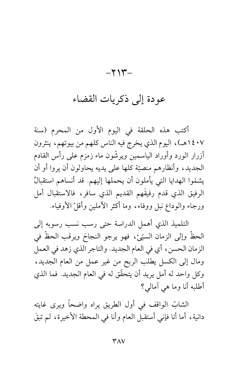 أكتب هذه الحلقة في اليوم الأول من المحرم (سنة 1407هـ)، اليوم الذي يخرج فيه الناس كلهم من بيوتهم، ينثرون أزرار الورد وأوراد الياسمين ويرشّون ماء زمزم على رأس القادم الجديد، وأنظارهم منصبّة كلها على يديه يحاولون أن يروا أو أن يشمّوا الهدايا التي يأملون أن يحملها إليهم. قد أنساهم استقبالُ الرفيق الذي قدم رفيقَهم القديم الذي سافر، فالاستقبال أمل ورجاء والوداع نبل ووفاء، وما أكثر الآملين وأقلّ الأوفياء.