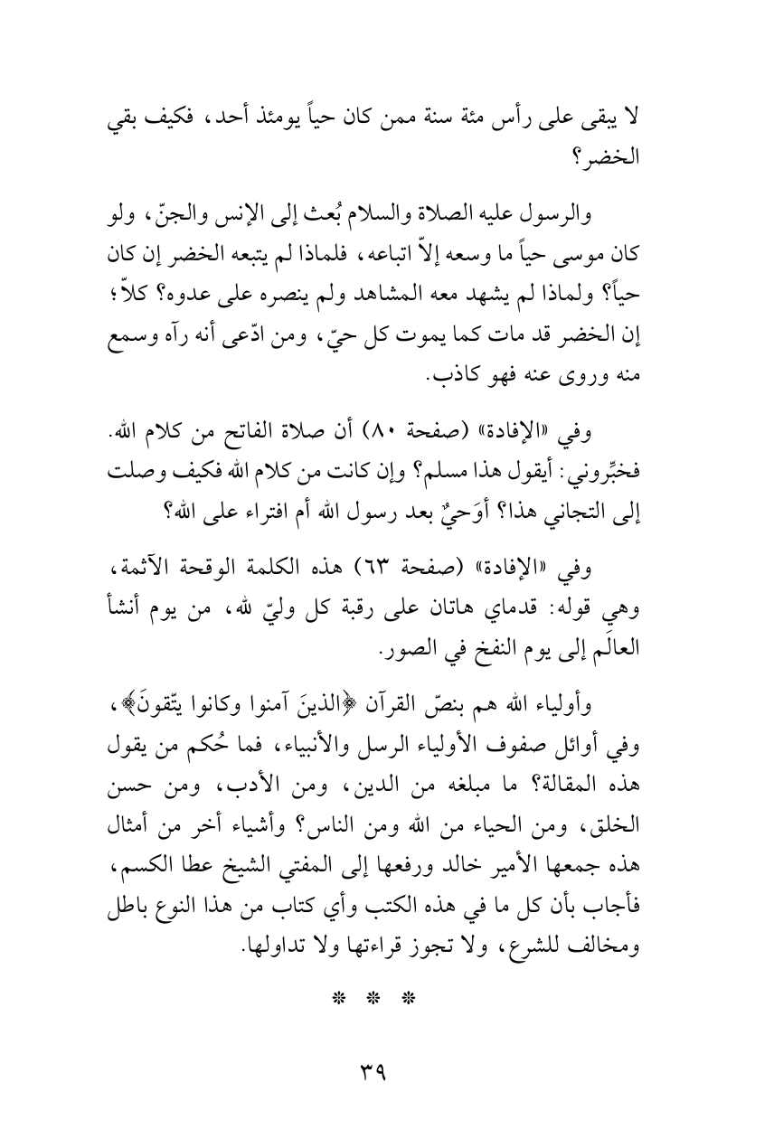 وأولياء الله هم بنصّ القرآن {الذينَ آمنوا وكانوا يتّقونَ}، وفي أوائل صفوف الأولياء الرسل والأنبياء، فما حُكم من يقول هذه المقالة؟ ما مبلغه من الدين، ومن الأدب، ومن حسن الخلق، ومن الحياء من الله ومن الناس؟ وأشياء أخر من أمثال هذه جمعها الأمير خالد ورفعها إلى المفتي الشيخ عطا الكسم، فأجاب بأن كل ما في هذه الكتب وأي كتاب من هذا النوع باطل ومخالف للشرع، ولا تجوز قراءتها ولا تداولها.
