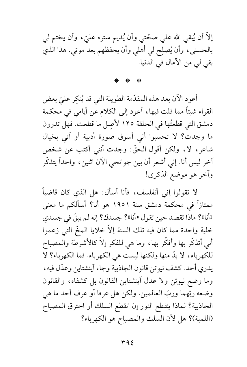 لا تقولوا إني أتفلسف، فأنا أسأل: هل الذي كان قاضياً ممتازاً في محكمة دمشق سنة 1951 هو أنا؟ أسألكم ما معنى «أنا»؟ ماذا تقصد حين تقول «أنا»؟ جسدك؟ إنه لم يبقَ في جسدي خلية واحدة مما كان فيه تلك السنة إلاّ خلايا المخّ التي زعموا أني أتذكّر بها وأفكّر بها، وما هي للفكر إلاّ كالأشرطة والمصباح للكهرباء، لا بدّ منها ولكنها ليست هي الكهرباء. فما الكهرباء؟ لا يدري أحد. كشف نيوتن قانون الجاذبية وجاء آينشتاين وعدّل فيه، وما وضع نيوتن ولا عدل آينشتاين القانون بل كشفاه، والقانون وضعه ربّهما وربّ العالمين. ولكن هل عرفا أو عرف أحد ما هي الجاذبية؟ لماذا ينقطع النور إن انقطع السلك أو احترق المصباح (اللمبة)؟ هل لأن السلك والمصباح هو الكهرباء؟