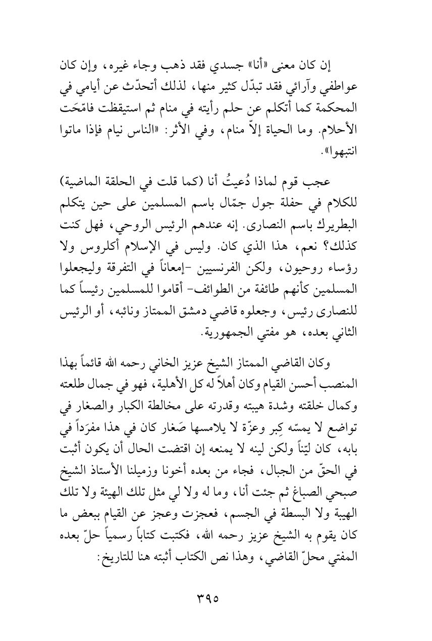 عجب قوم لماذا دُعيتُ أنا (كما قلت في الحلقة الماضية) للكلام في حفلة جول جمّال باسم المسلمين على حين يتكلم البطريرك باسم النصارى. إنه عندهم الرئيس الروحي، فهل كنت كذلك؟ نعم، هذا الذي كان. وليس في الإسلام أكلروس ولا رؤساء روحيون، ولكن الفرنسيين -إمعاناً في التفرقة وليجعلوا المسلمين كأنهم طائفة من الطوائف- أقاموا للمسلمين رئيساً كما للنصارى رئيس، وجعلوه قاضي دمشق الممتاز ونائبه، أو الرئيس الثاني بعده، هو مفتي الجمهورية.