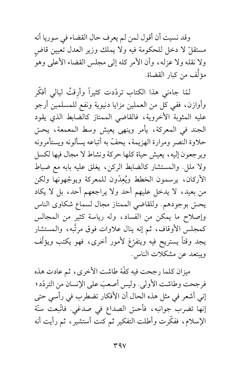 لمّا جاءني هذا الكتاب تردّدت كثيراً وأرِقتُ ليالي أفكّر وأوازن، ففي كل من العملين مزايا دنيوية ونفع للمسلمين أرجو عليه المثوبة الأخروية، فالقاضي الممتاز كالضابط الذي يقود الجند في المعركة، يأمر وينهى يعيش وسط المعمعة، يحسّ حلاوة النصر ومرارة الهزيمة، يحفّ به أتباعه يسألونه ويستأمرونه ويرجعون إليه، يعيش حياة كلها حركة ونشاط لا مجال فيها لكسل ولا ملل. والمستشار كالضابط الركن، يغلق عليه بابه مع ضباط الأركان، يرسمون الخطط ويُعِدّون للمعركة ويوجّهونها ولكن من بعيد، لا يدخل عليهم أحد ولا يراجعهم أحد، بل لا يكاد يحسّ بوجودهم. وللقاضي الممتاز مجال لسماع شكاوى الناس وإصلاح ما يمكن من الفساد، وله رياسة كثير من المجالس كمجلس الأوقاف، ثم إنه ينال علاوات فوق مرتَّبه، والمستشار يجد وقتاً يستريح فيه ويتفرّغ لأمور أخرى، فهو يكتب ويؤلّف ويبتعد عن مشكلات الناس.