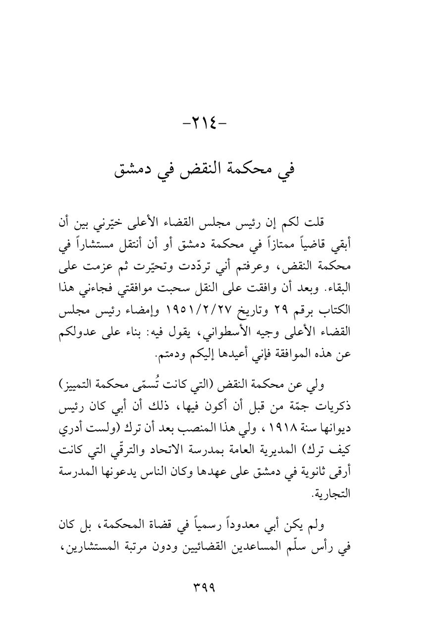 ولي عن محكمة النقض (التي كانت تُسمّى محكمة التمييز) ذكريات جمّة من قبل أن أكون فيها، ذلك أن أبي كان رئيس ديوانها سنة 1918، ولي هذا المنصب بعد أن ترك (ولست أدري كيف ترك) المديرية العامة بمدرسة الاتحاد والترقّي التي كانت أرقى ثانوية في دمشق على عهدها وكان الناس يدعونها المدرسة التجارية.