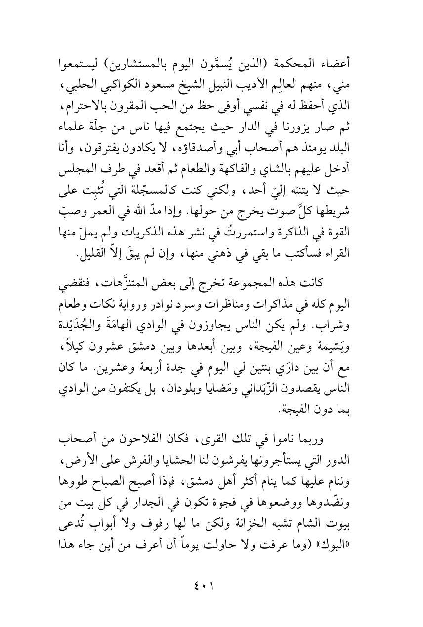 أعضاء المحكمة (الذين يُسمَّون اليوم بالمستشارين) ليستمعوا مني، منهم العالِم الأديب النبيل الشيخ مسعود الكواكبي الحلبي، الذي أحفظ له في نفسي أوفى حظ من الحب المقرون بالاحترام، ثم صار يزورنا في الدار حيث يجتمع فيها ناس من جلّة علماء البلد يومئذ هم أصحاب أبي وأصدقاؤه، لا يكادون يفترقون، وأنا أدخل عليهم بالشاي والفاكهة والطعام ثم أقعد في طرف المجلس حيث لا يتنبّه إليّ أحد، ولكني كنت كالمسجّلة التي تُثبِت على شريطها كلَّ صوت يخرج من حولها. وإذا مدّ الله في العمر وصبّ القوة في الذاكرة واستمررتُ في نشر هذه الذكريات ولم يملّ منها القراء فسأكتب ما بقي في ذهني منها، وإن لم يبقَ إلاّ القليل.