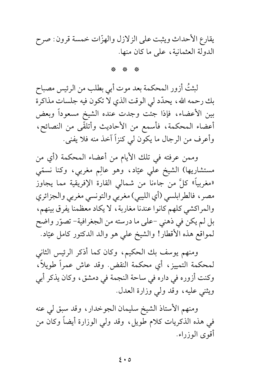لبثتُ أزور المحكمة بعد موت أبي بطلب من الرئيس مصباح بك رحمه الله، يحدّد لي الوقت الذي لا تكون فيه جلسات مذاكرة بين الأعضاء، فإذا جئت وجدت عنده الشيخ مسعوداً وبعض أعضاء المحكمة، فأسمع من الأحاديث وأتلقّى من النصائح، وأعرف من الرجال ما يكون لي كنزاً آخذ منه فلا يفنى.