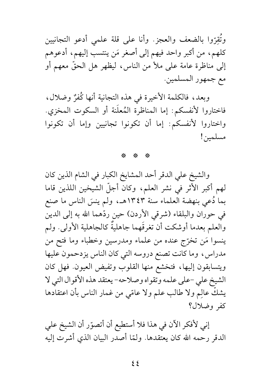 إني لأفكر الآن في هذا فلا أستطيع أن أتصوّر أن الشيخ علي الدقر رحمه الله كان يعتقدها. ولمّا أصدر البيان الذي أشرت إليه