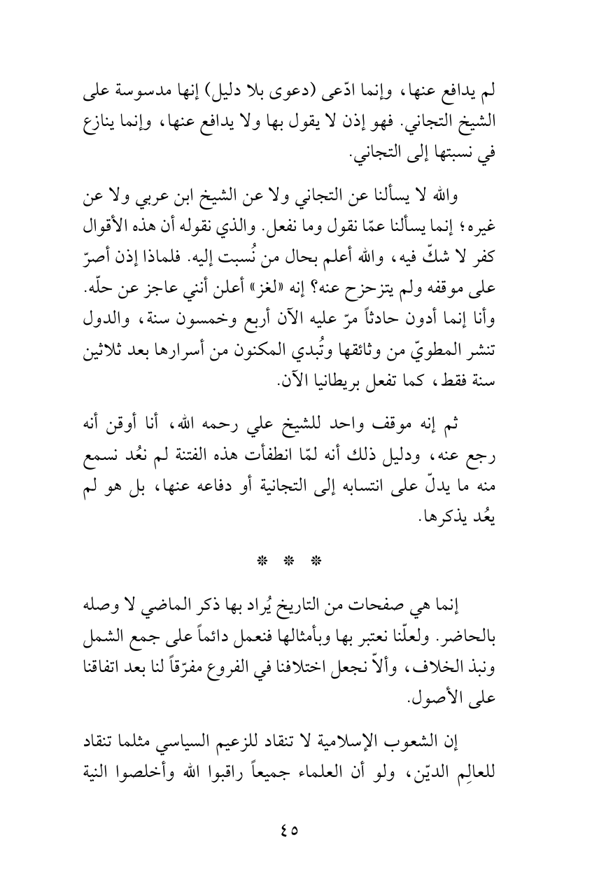 إنما هي صفحات من التاريخ يُراد بها ذكر الماضي لا وصله بالحاضر. ولعلّنا نعتبر بها وبأمثالها فنعمل دائماً على جمع الشمل ونبذ الخلاف، وألاّ نجعل اختلافنا في الفروع مفرّقاً لنا بعد اتفاقنا على الأصول.